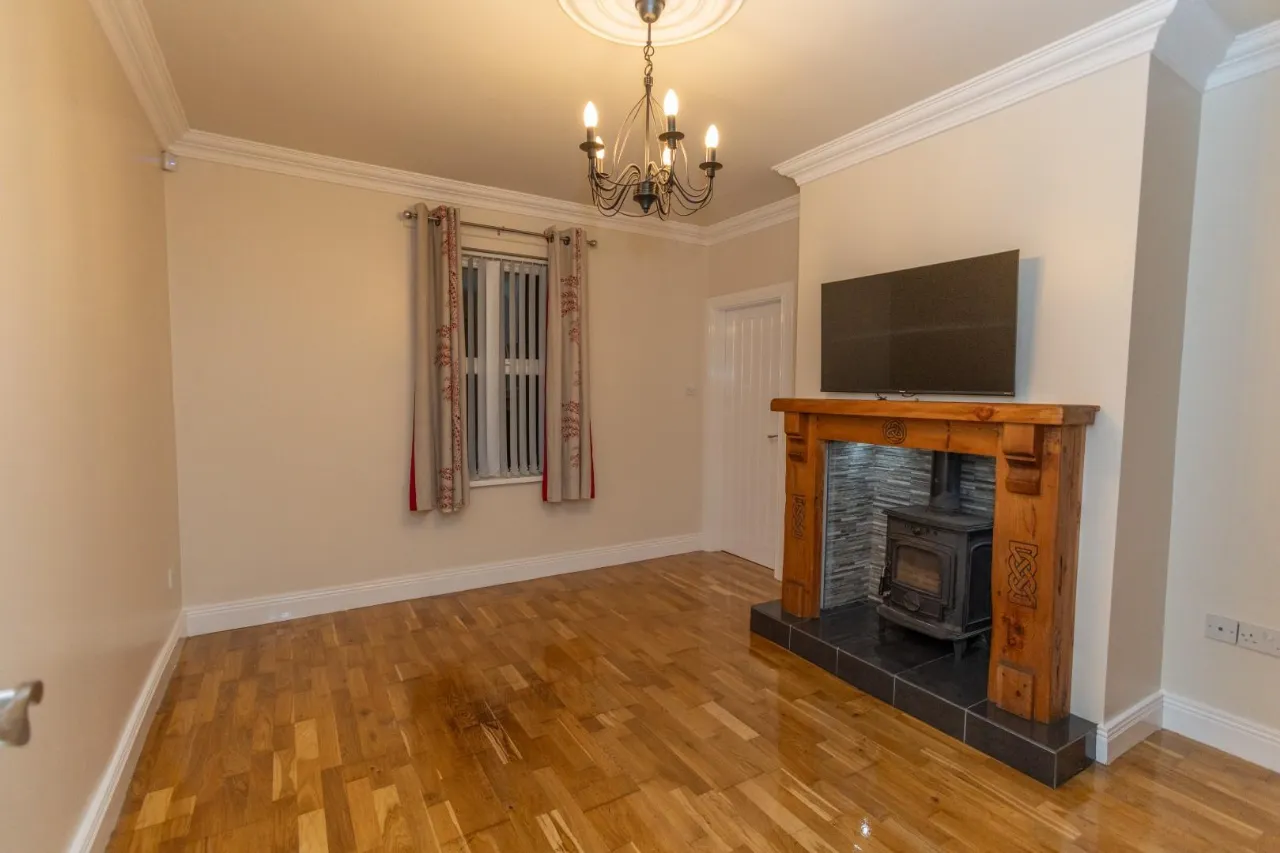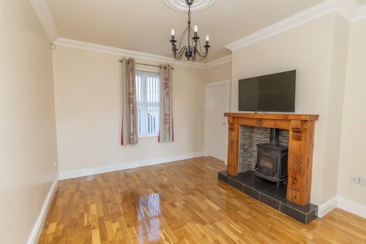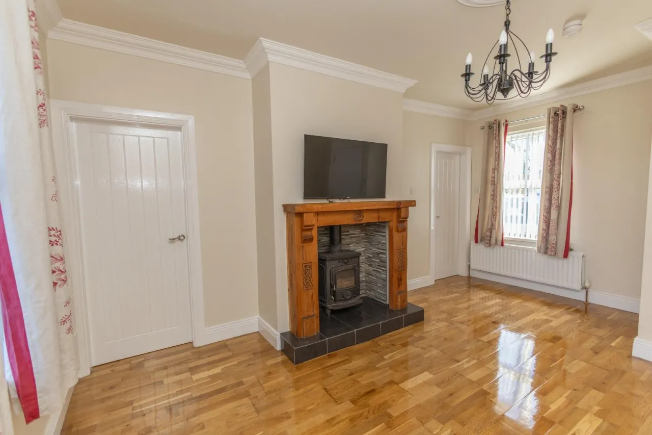 Recently varnished hard wood flooring, Multi fuel stove, Decorative fireplace with timber surround and tiled inset.