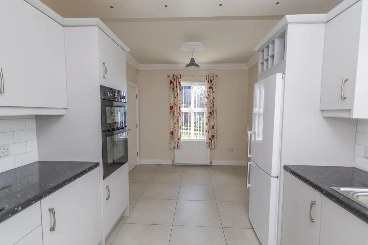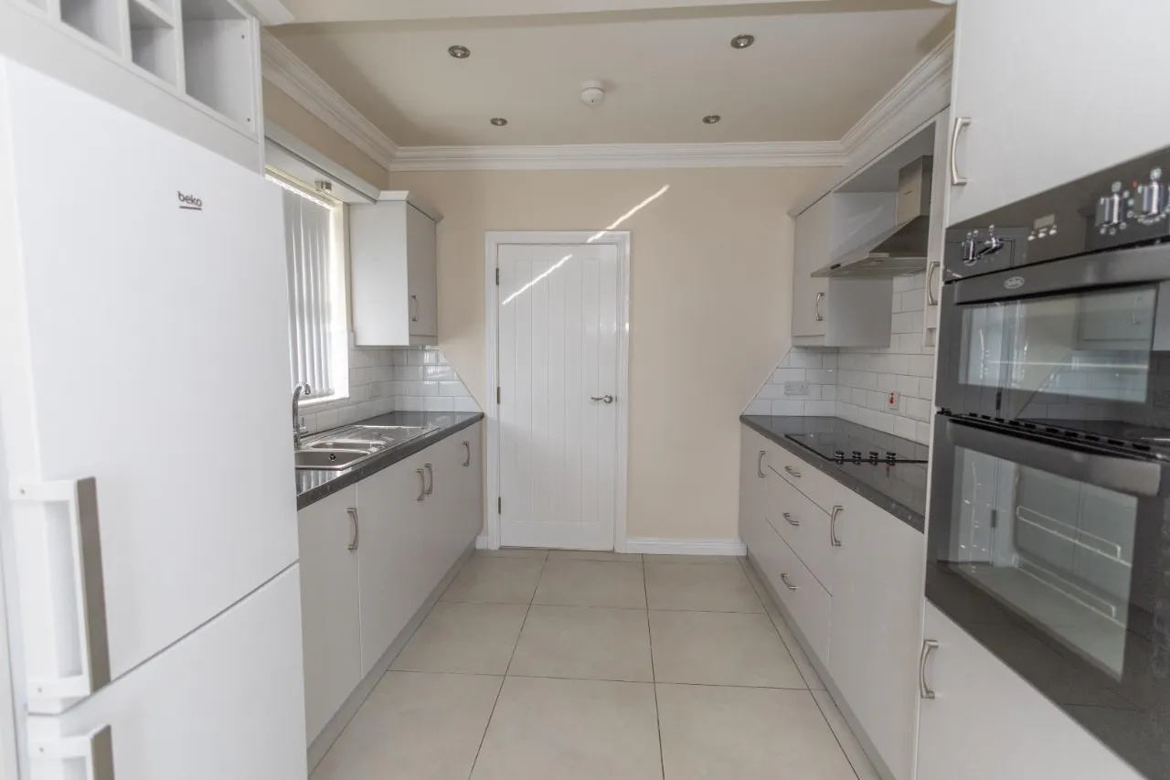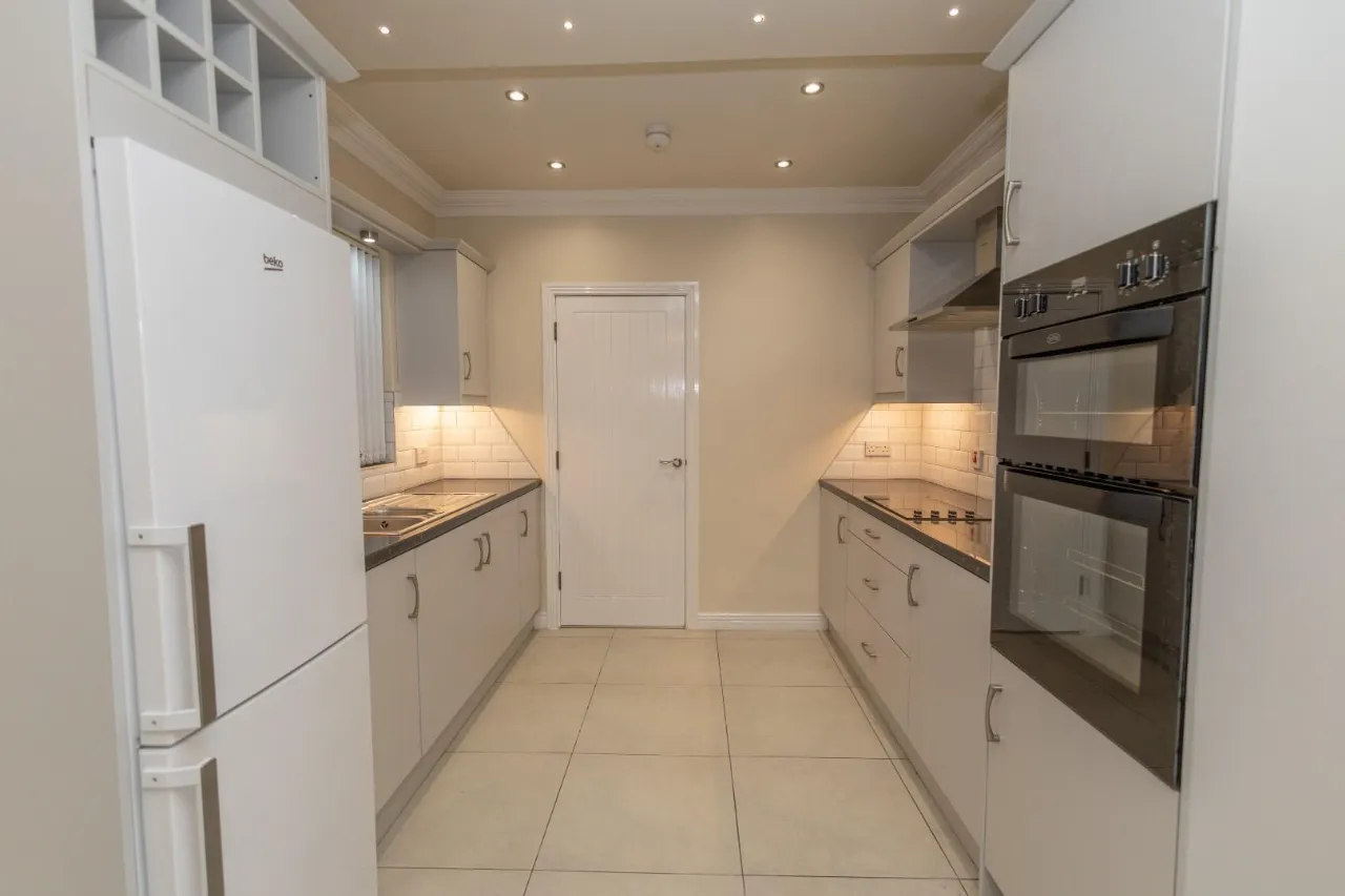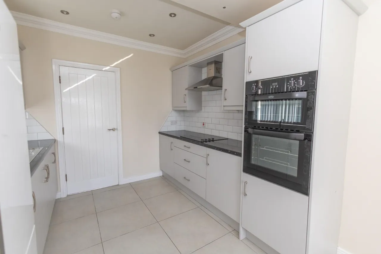 Tiled floor, High and low level storage units, Recessed lighting in ceiling, Belling cooker/ oven, Belling electric hob, NordeMende extractor fan, tiled splash back, Marble effect worktop.