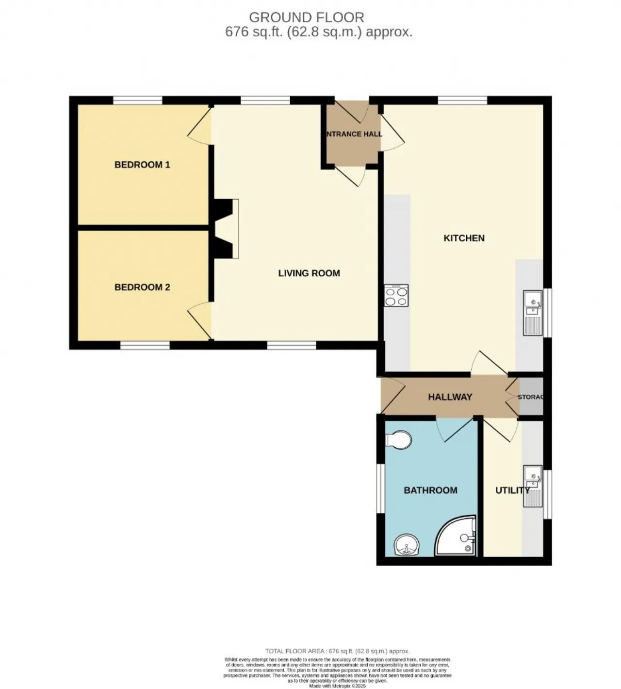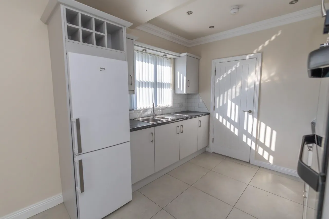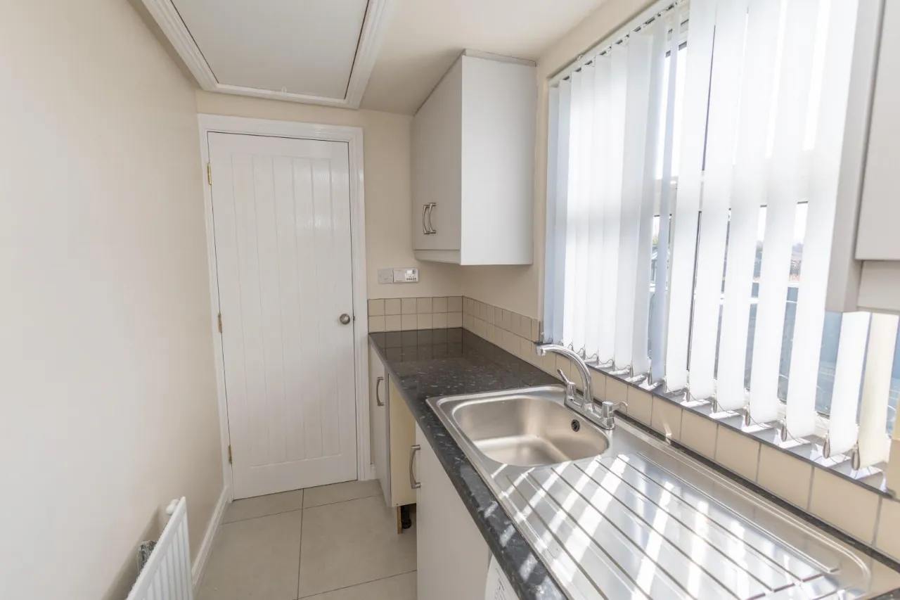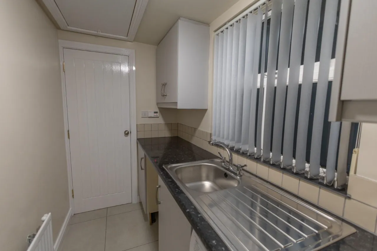 Tiled floor, High and low level storage units, Washing machine and space for dryer, Marble effect worktop, Radiator, Extendable Attic ladder, Floored Attic.