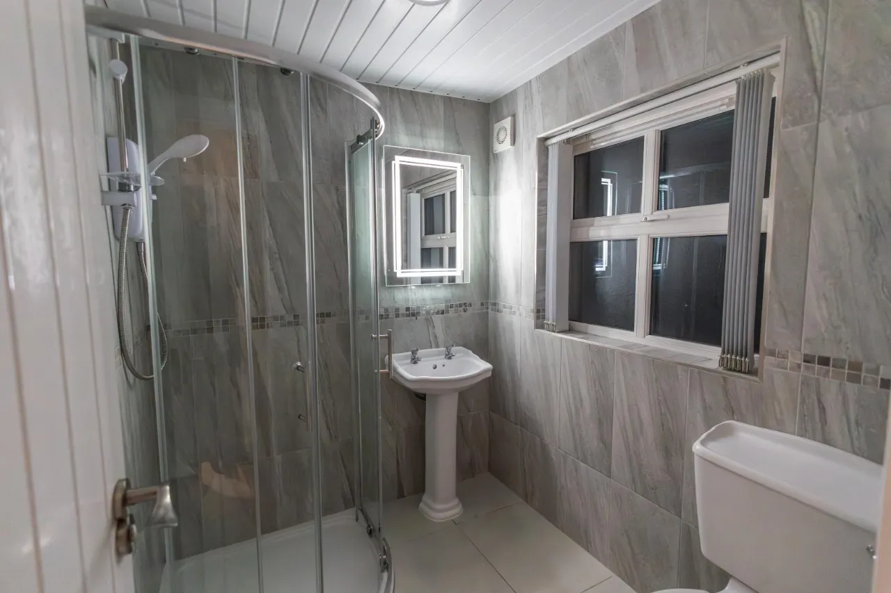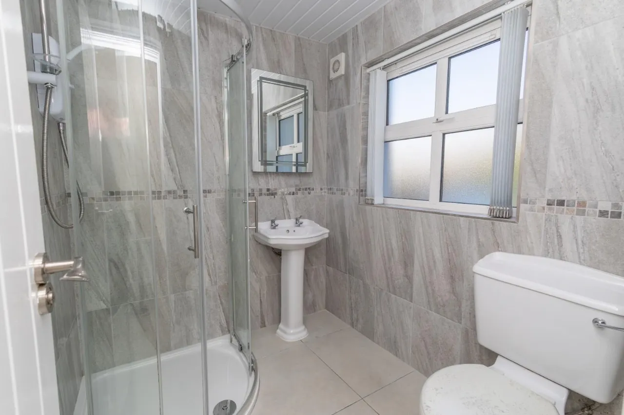 Decorative tiled walls and floor, Pedestal basin sink, Electric shower with sliding doors, Extractor fan, Toilet.