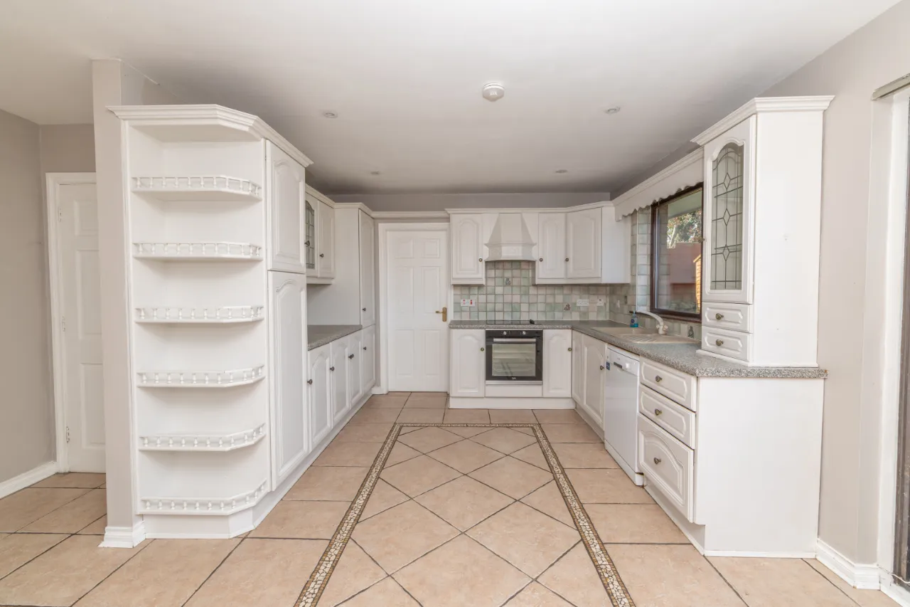 Tiled floor, high and low level storage units, sliding patio door leading to rear, electric hob and cooker.