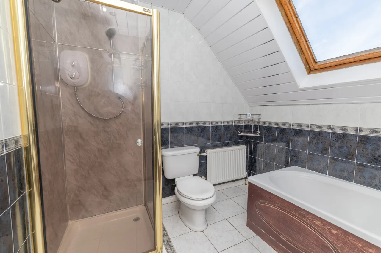 Tiled surround, PVC Ceilling, seperate bath and electric shower, toilet, sink, velux window.