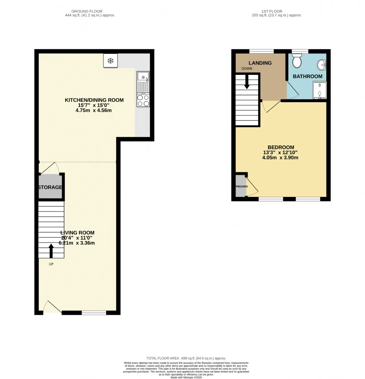 The accommodation is arranged in a practical and well-proportioned layout, featuring a living room which opens through to the kitchen, creating a connected and functional living space. The property also includes one well-sized bedroom and benefits from its end-terrace position, offering additional privacy.