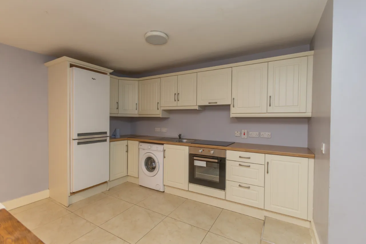 Tiled flooring,laminate wood kitchen worktop and built in electric hob and cooker. High and low storage units.