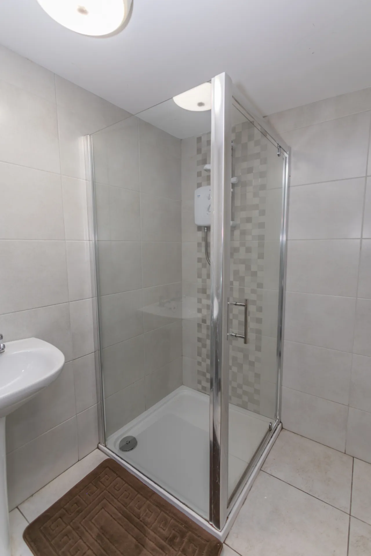 Tiled flooring and walls, stand alone electric shower and a dual flush toilet. Sink and small double glazed window.