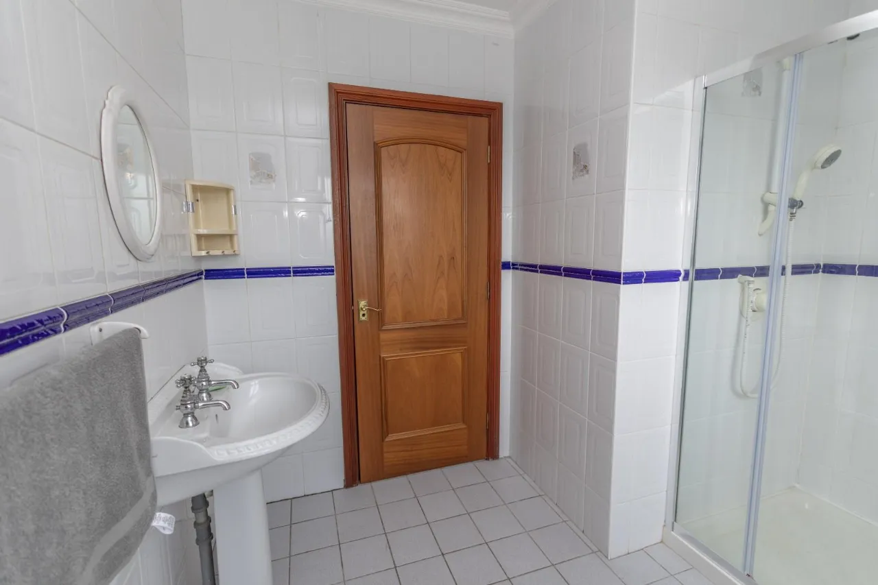 Tiled flooring and walls. Electric corner shower and extractor fan. Toilet and round steel tapped sink. Small high level corner shelf and double glazed windows