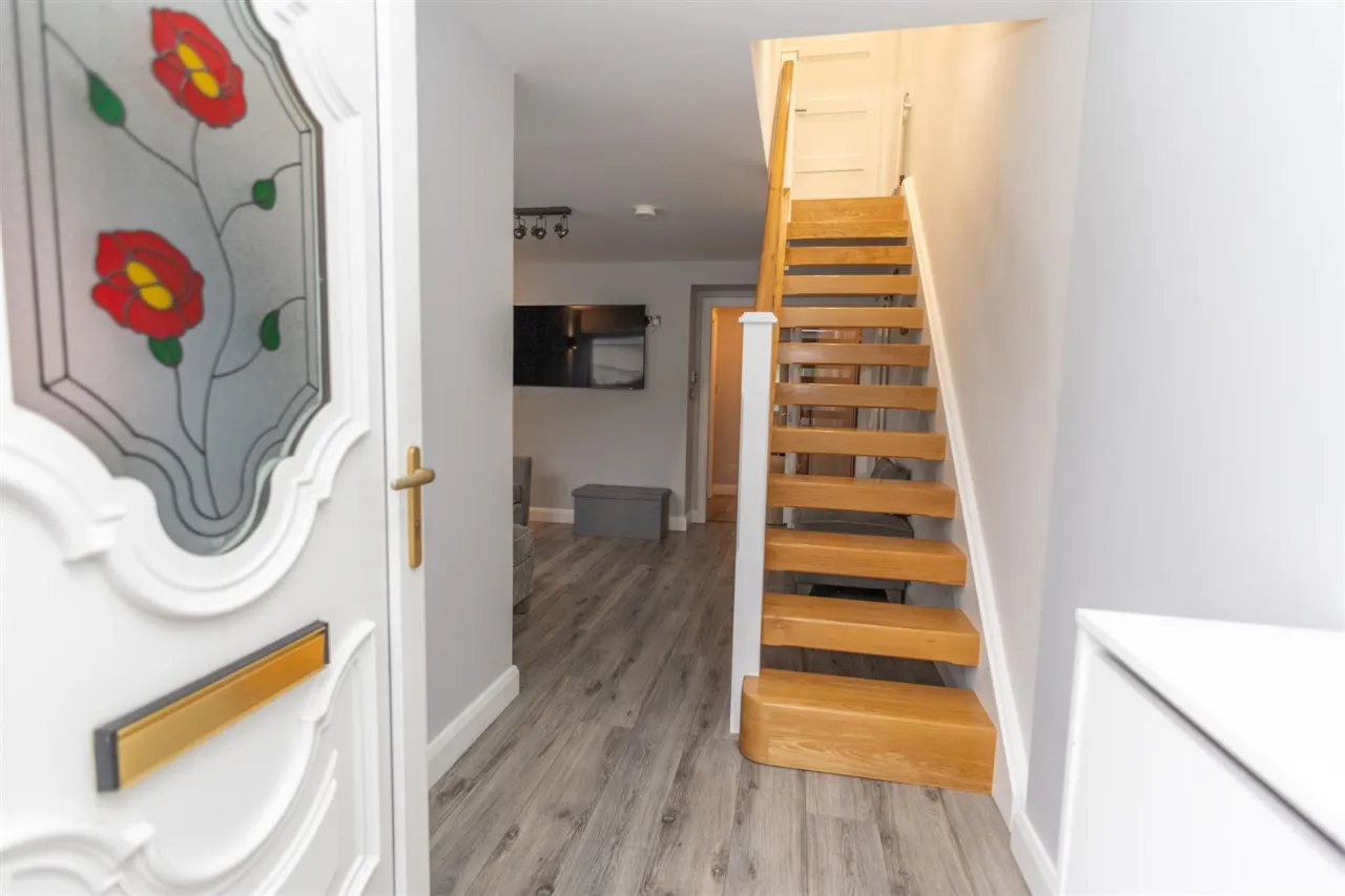 PVC front door with decorative glass panels. Laminate flooring. Storage unit.