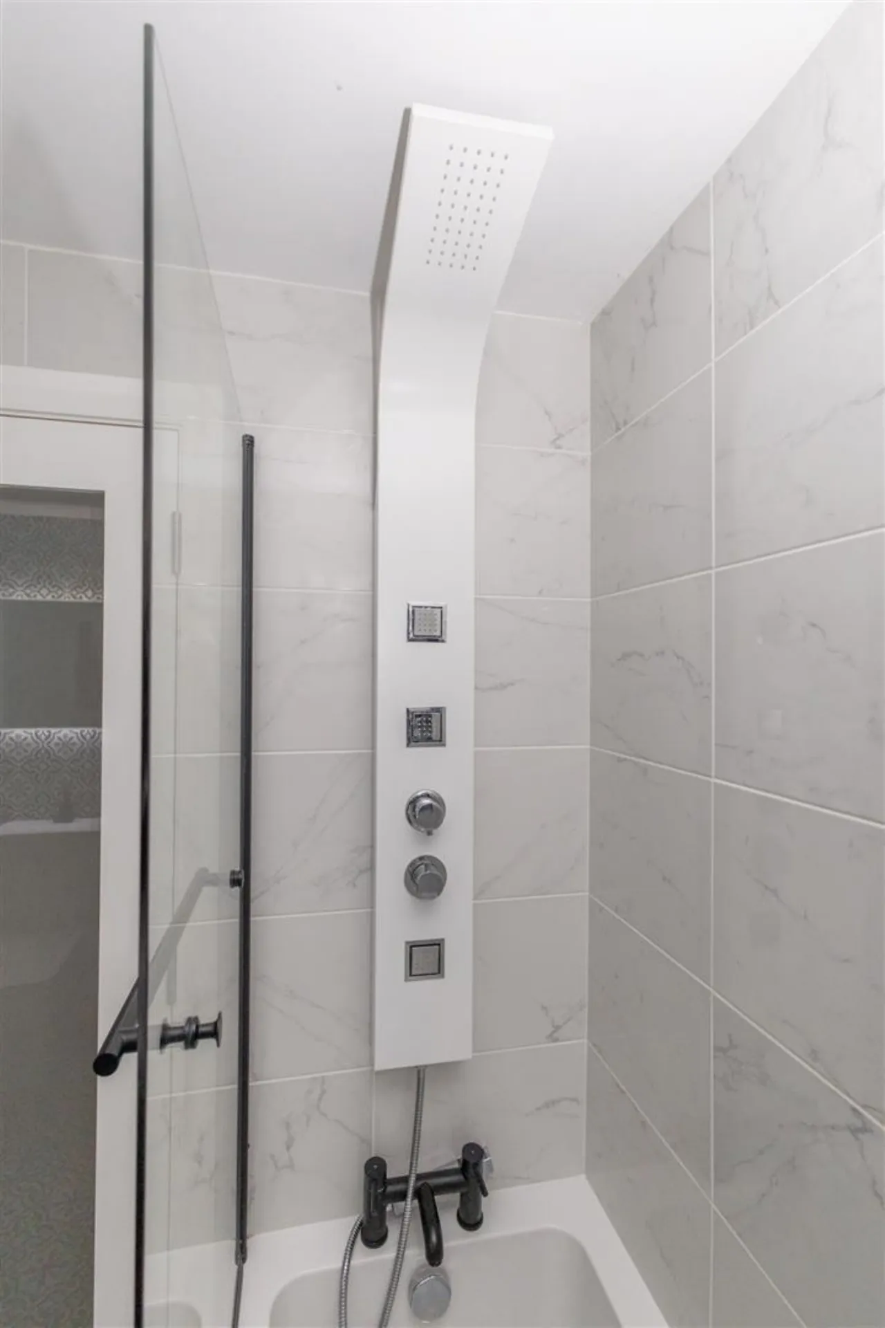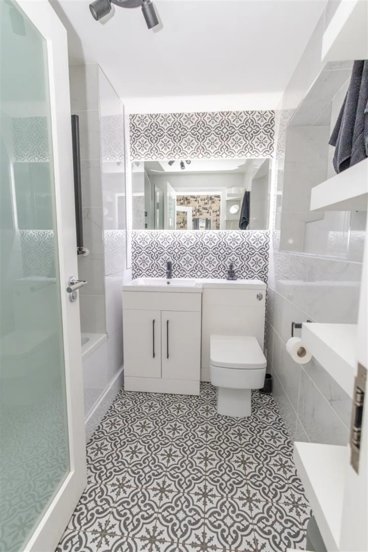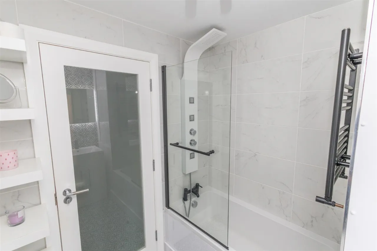 Fully tiled floor and walls. Low flush wc. Sink and vanity unit. Bluetooth mirror. Bath with a thermostatic shower overhead. Wall mounted radiator. Shelving.