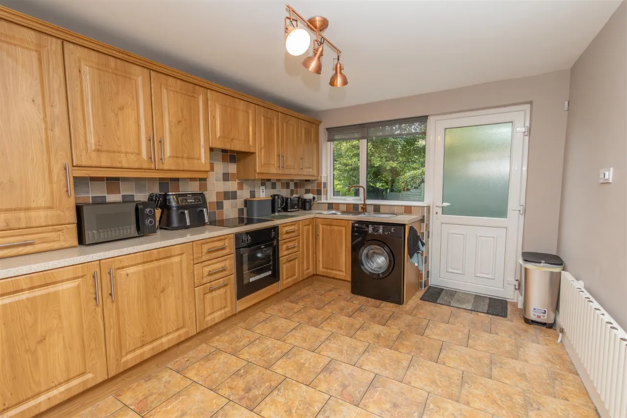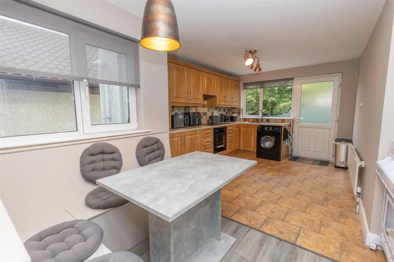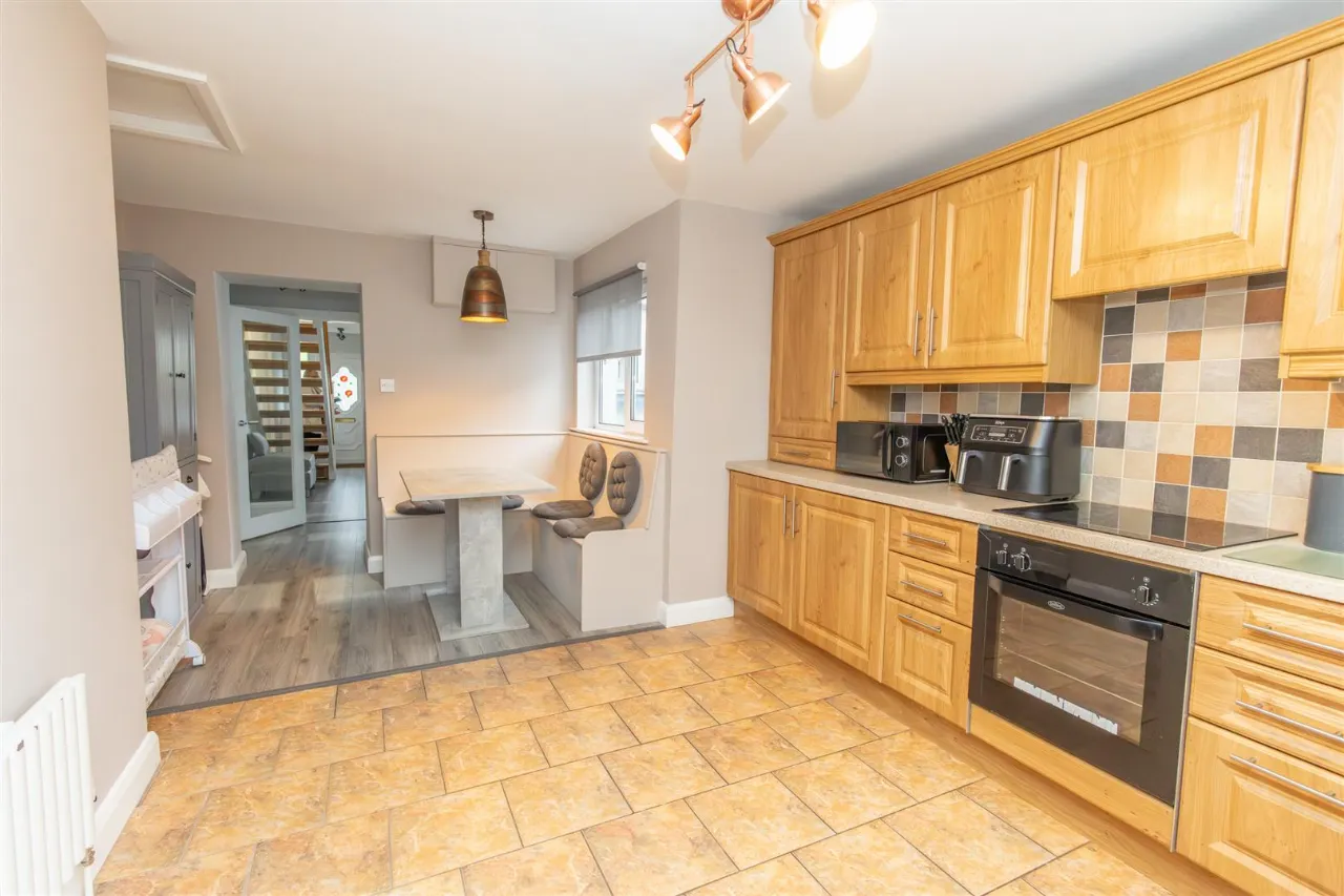 Tiled and laminate flooring. Partially tiled walls. High and low kitchen wall units. Electric hob and oven. Stainless steel sink. Integrated fridge and freezer. Seating bench. PVC door leading to rear of property.
