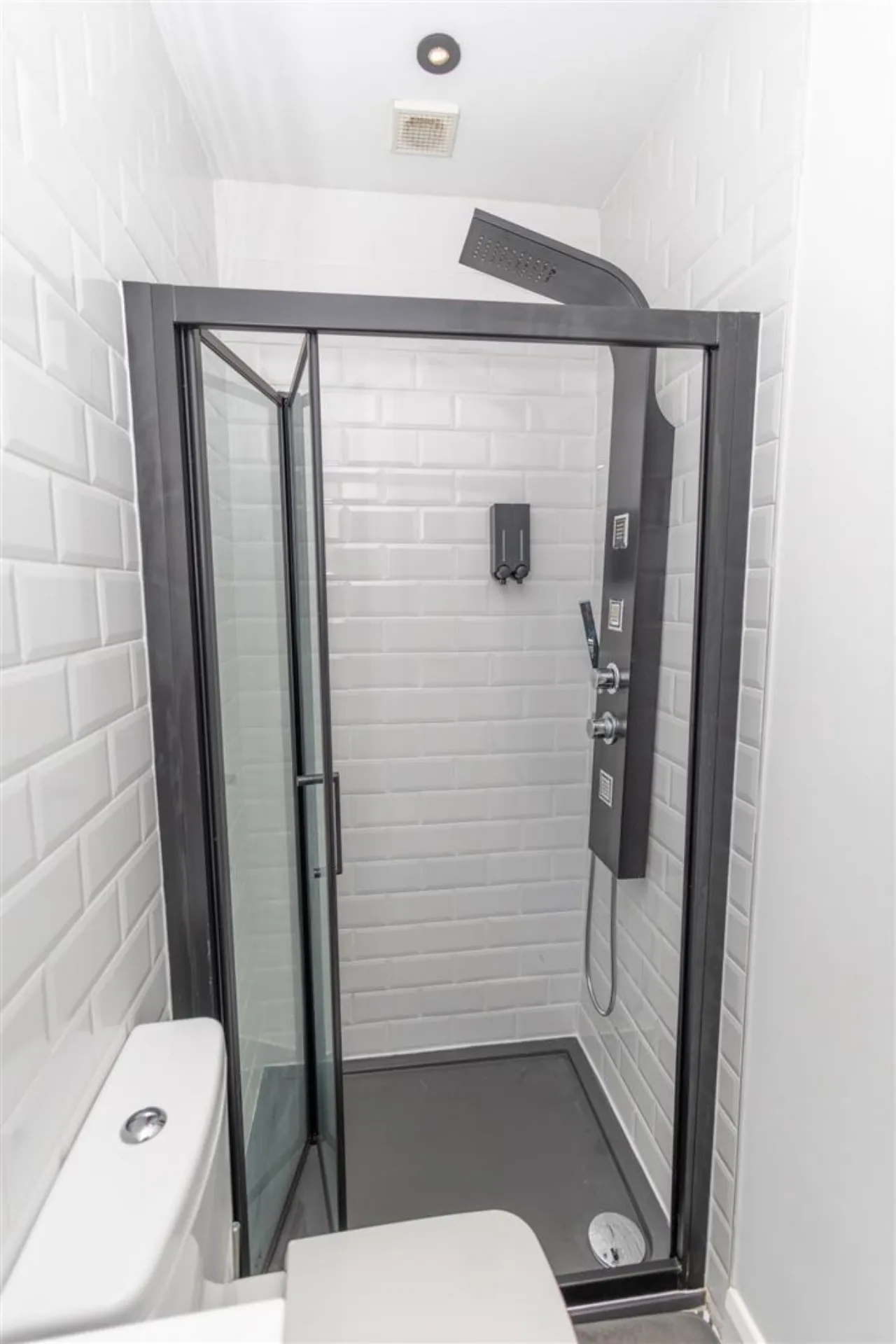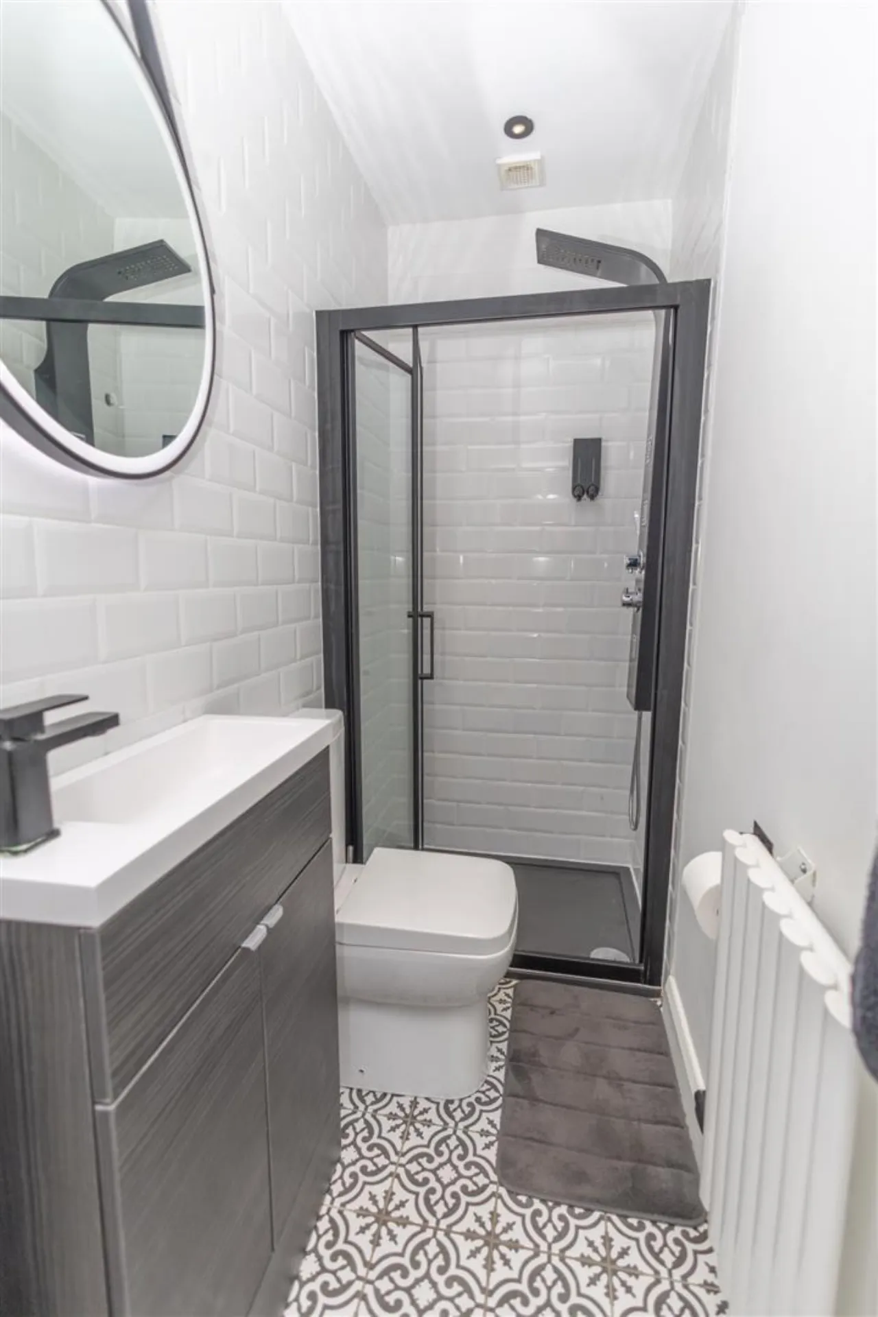 Tiled flooring. Fully tiled walls. Contemporary style sink and vanity. Low flush wc. Shower cubicle with thermostat shower. Wall mounted mirror with light.