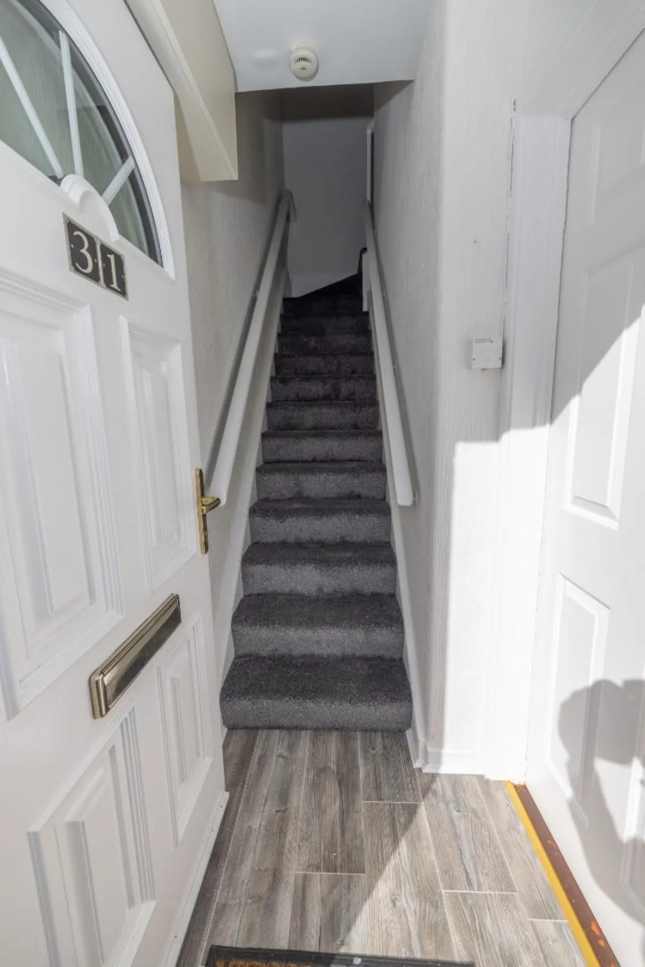 White PVC front door with glass panels. Wood style flooring. Carpet covered stairs leading to the first floor.