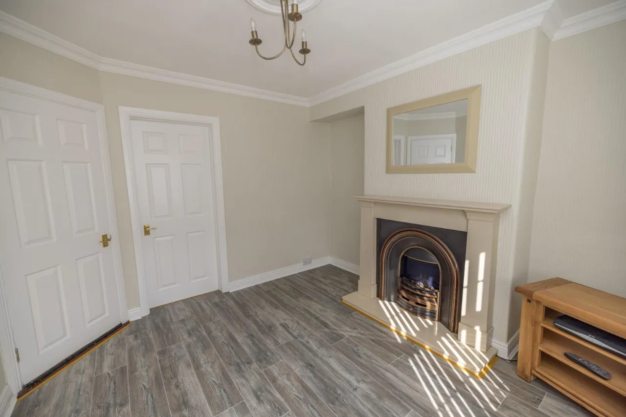 Grey wooden style flooring. Wallpapered walls. White ceiling cornice with ceiling rose and 3 bulb brass coloured light.
