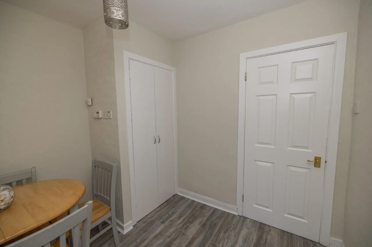 Grey wooden style flooring. Ceiling light. Vertical window blinds. Curtain rail. Hotpress.