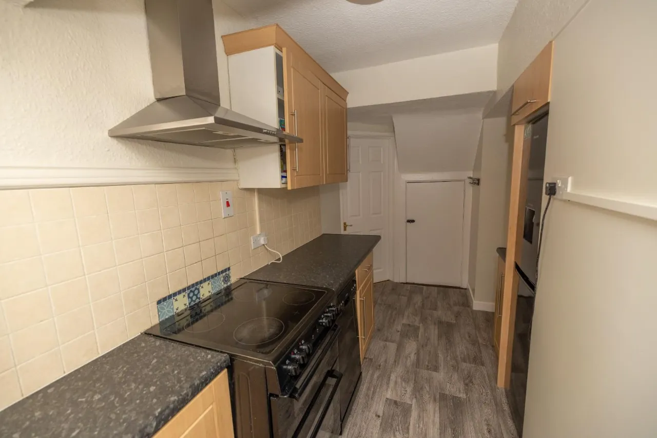 Grey wooden style flooring. High and low kitchen units. Stainless steel sink. Electric hob and oven with stainless steel extractor fan.