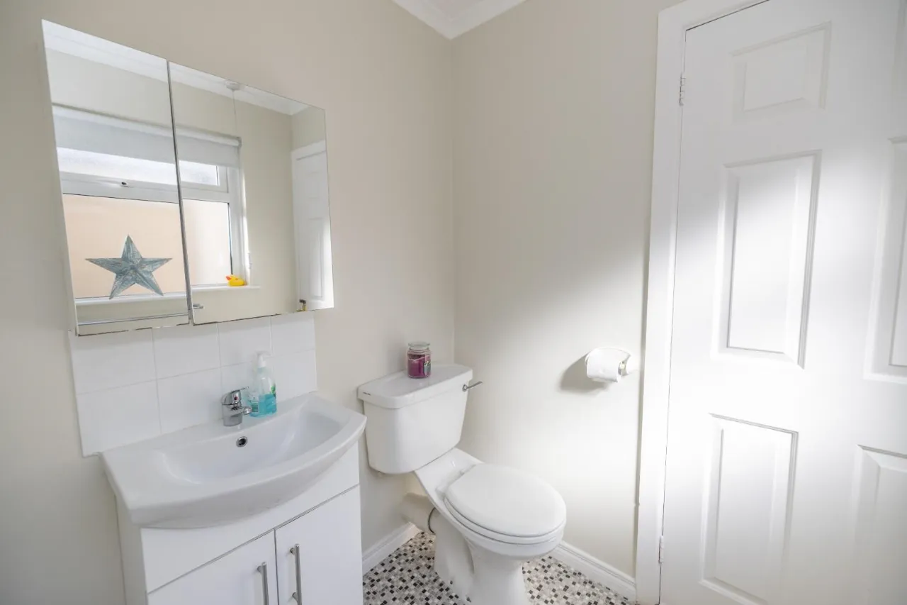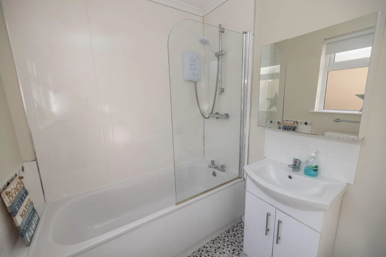Vinyl flooring. Painted walls with shower panels around the bath /shower area. White bathroom suite - bath, sink with vanity unit and low flush wc. Electric shower. Mirrored cabinet