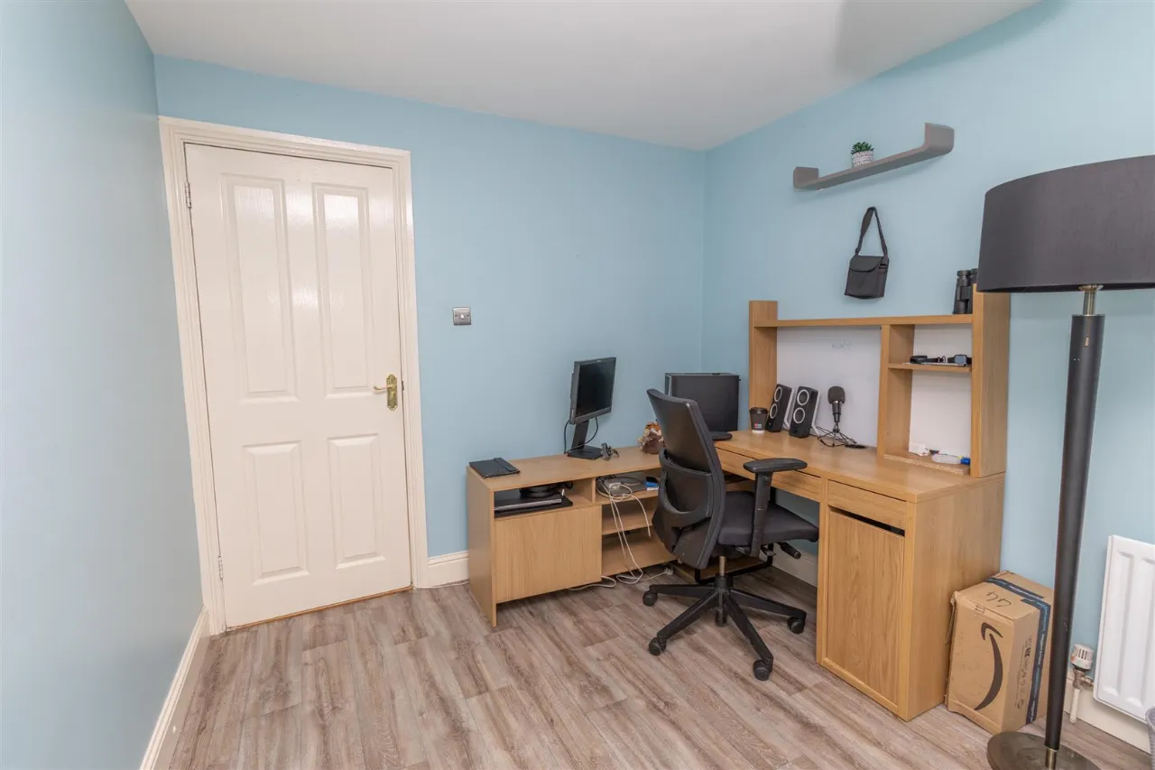 Detached office located to the rear of the garden. Carpet flooring, fitted out for office use. Upstairs living accommodation & bathroom.