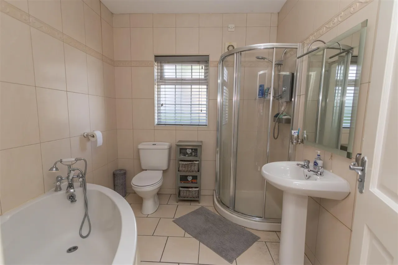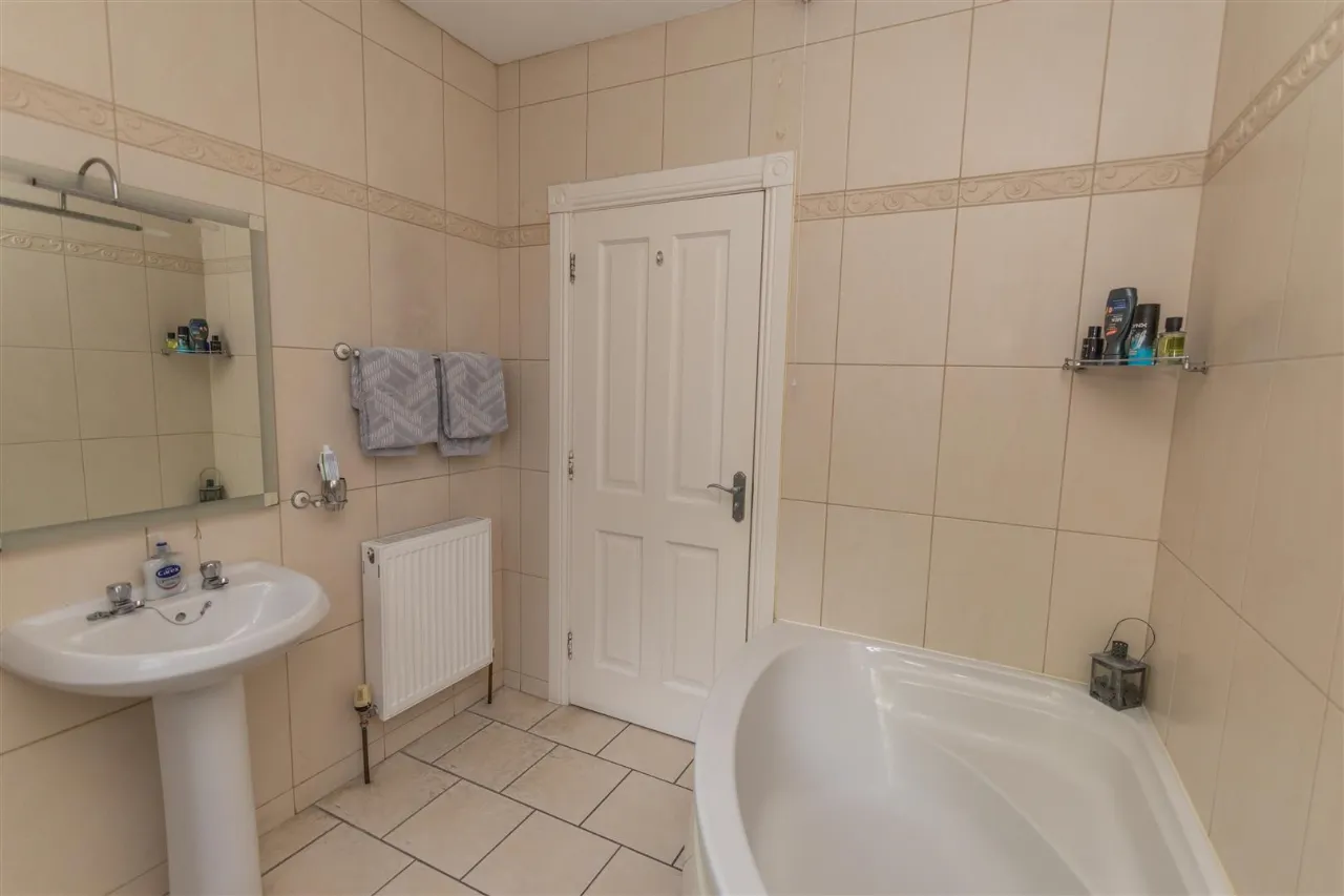Tiled flooring and fully tiled walls. Pedestal sink. Separate bath and shower, with extractor fan.