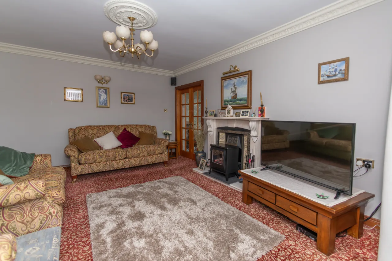 Carpet floor, decorative marble fireplace and hearth, large bay window, double doors leading to sunroom.
