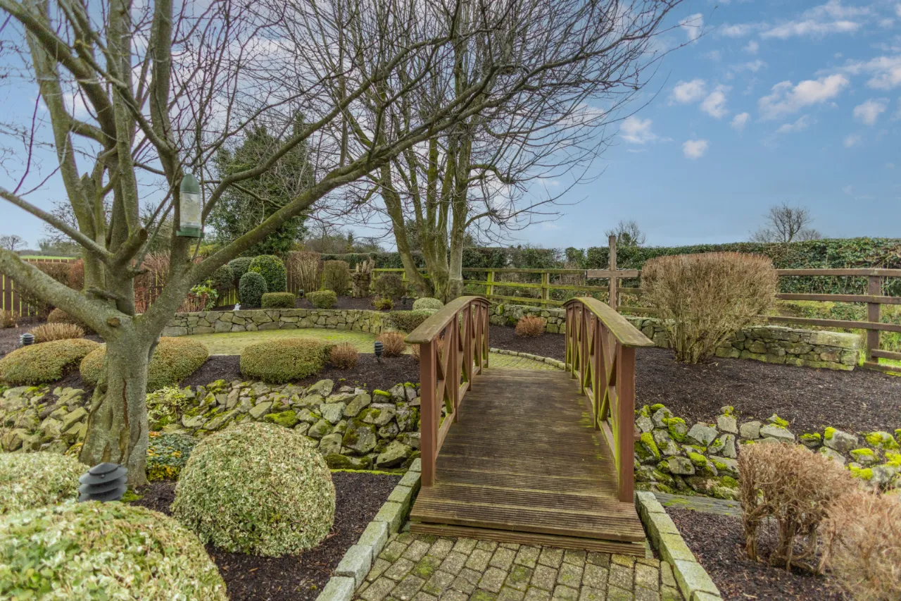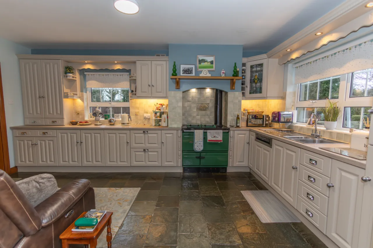 Decprative tiled floor, high and low level stoarge units with recessed down lights, tiled splashback surround, aga.