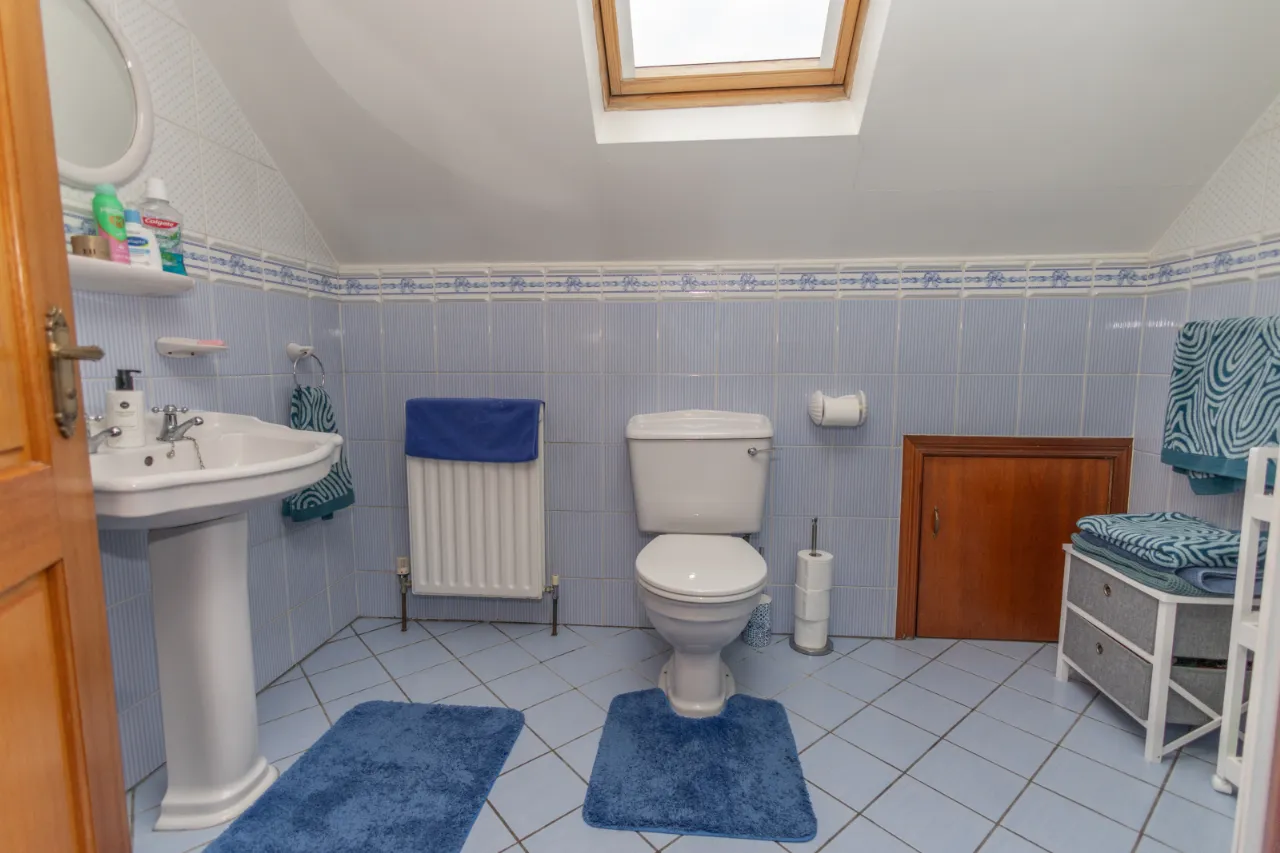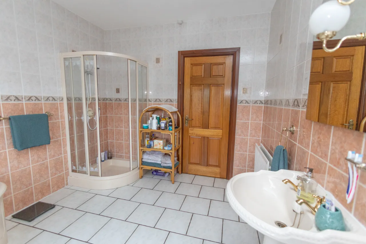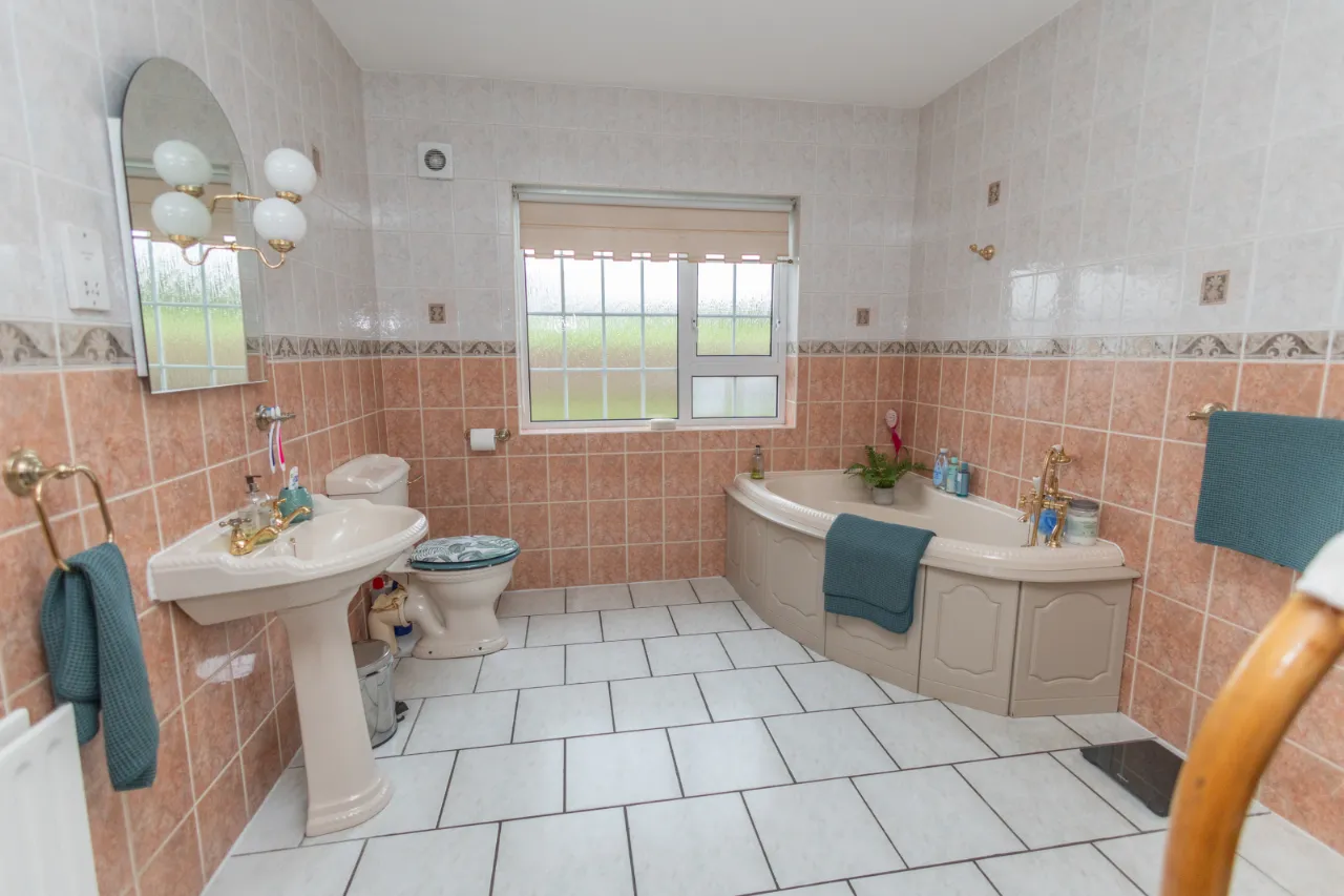 Tiled surround, seperate bath and shower, extractor fan, toilet, sink.