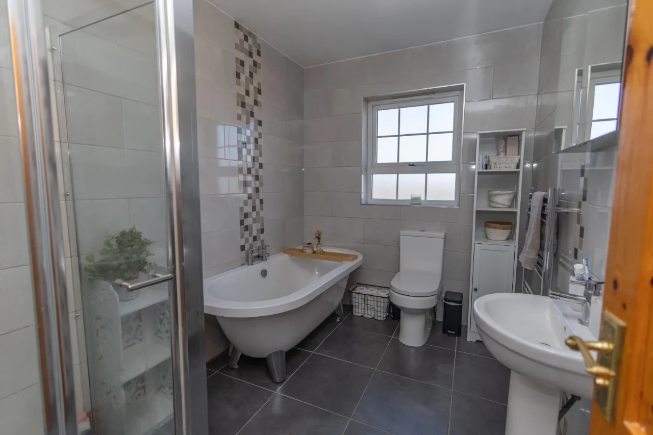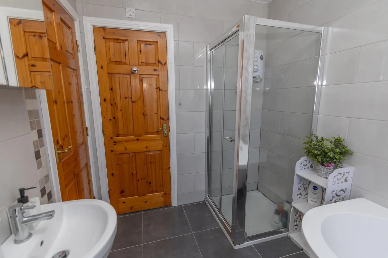 Tiled floor, Separate bath and electric shower, pedestal sink