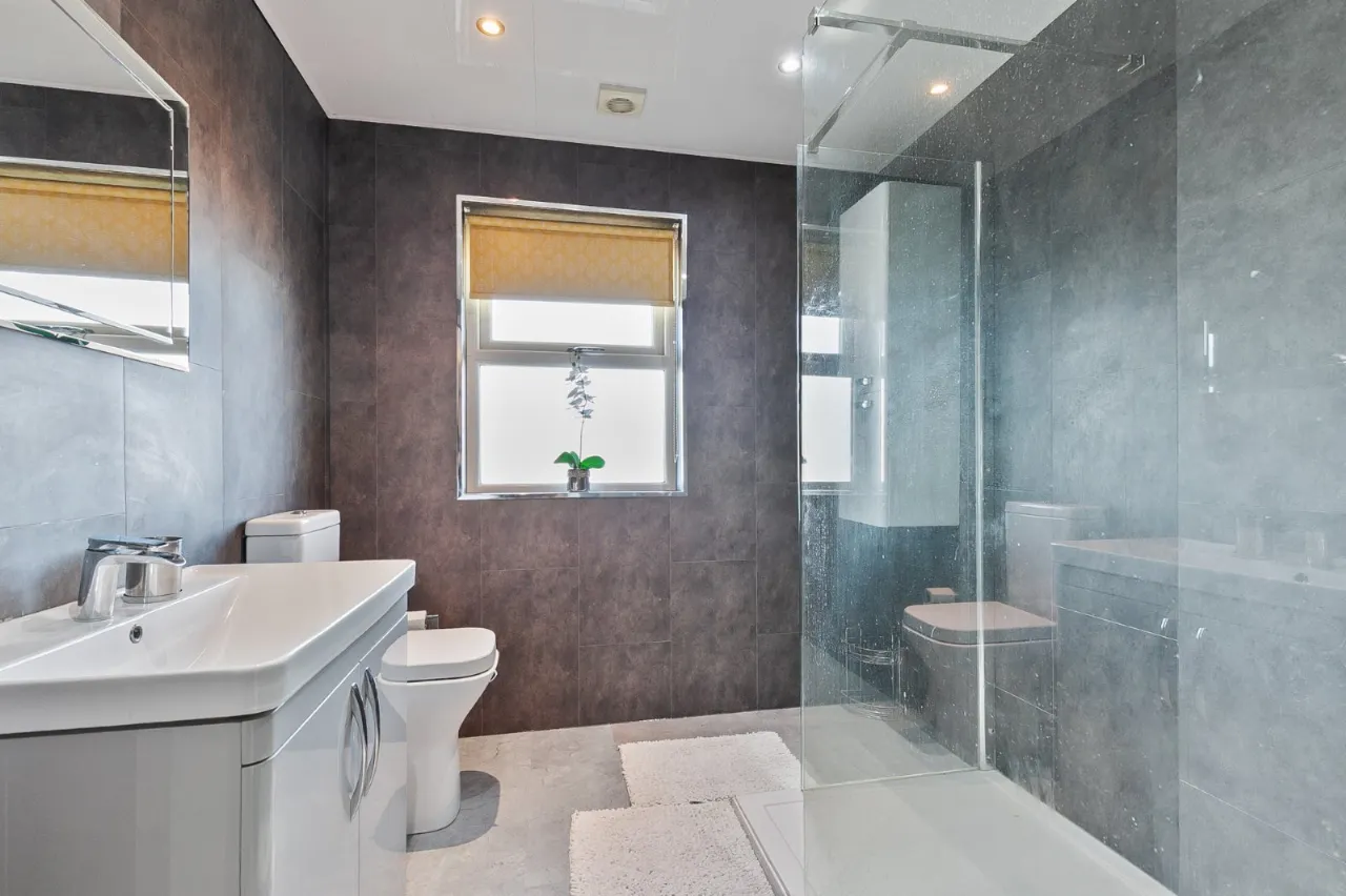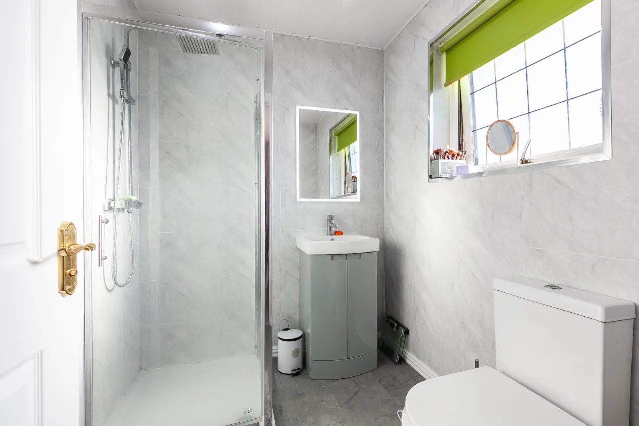 Walk in shower, low flush WC, sink with mixer taps, fully tiled floor and walls