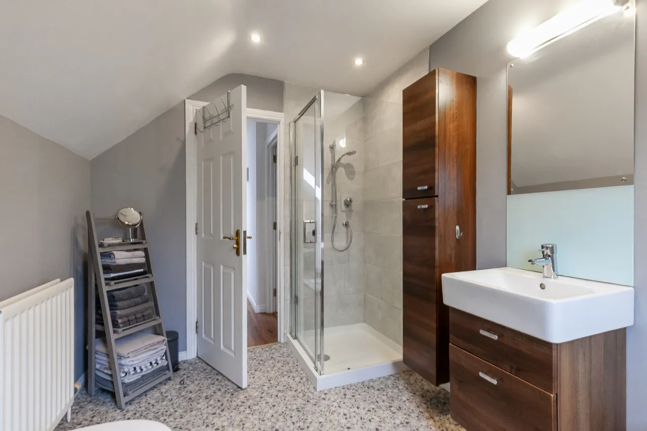Comprises of enclosed corner shower unit with shower screen, ceramic bowl sink unit with vanity unit and storage underneath. Low flush WC, tiled floor, recessed lighting and extractor fan.