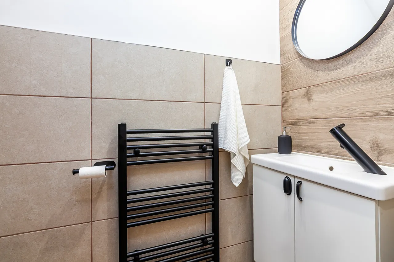 Comprises of ceramic bowl sink unit with vanity storage underneath, low flush WC, heated towel rail, partly tiled walls, tiled floor and extractor fan.