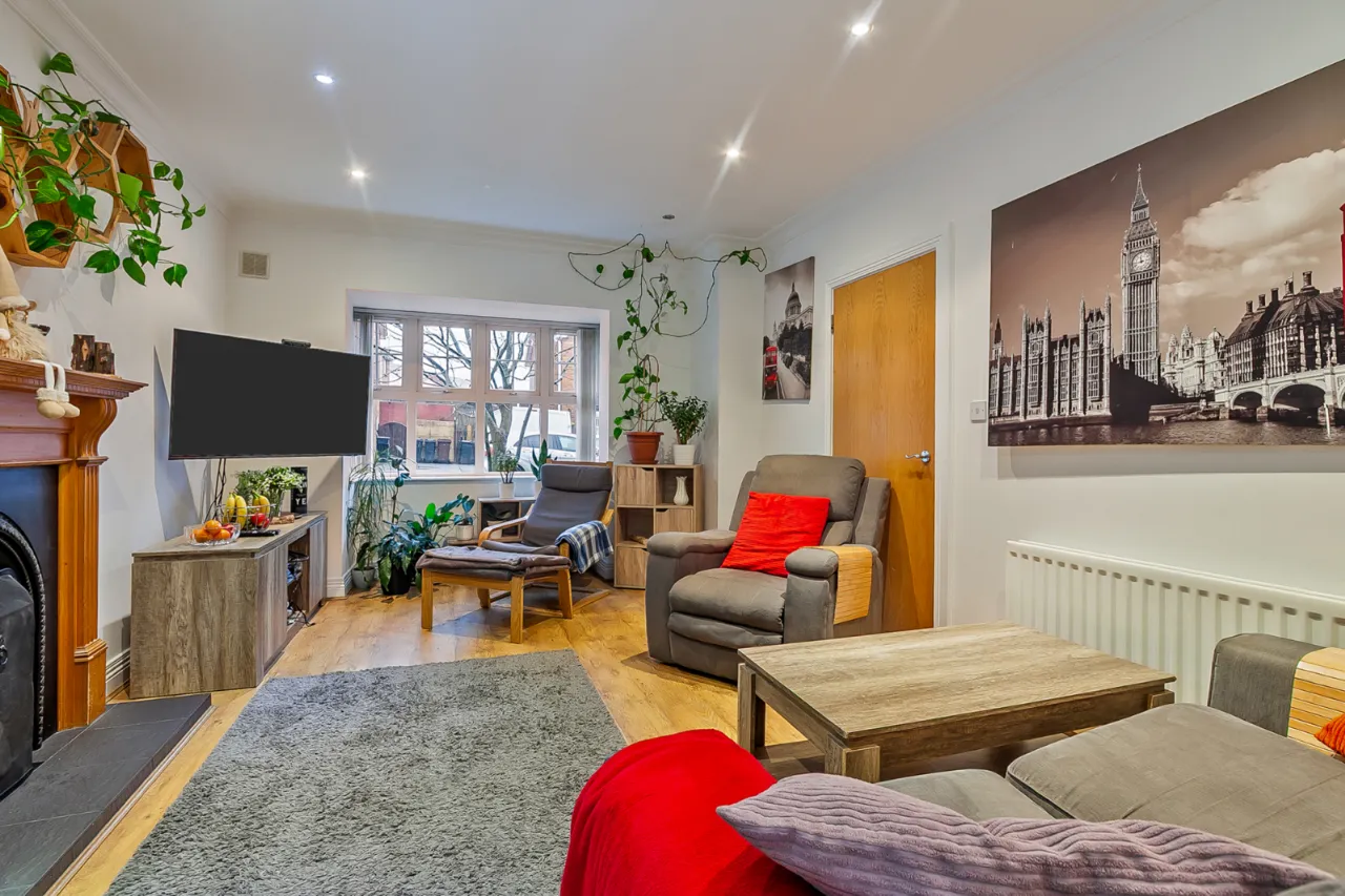 Feature bay window, corniced ceiling, recessed lighting, feature open fire place, laminate wooden floor and open plan to...