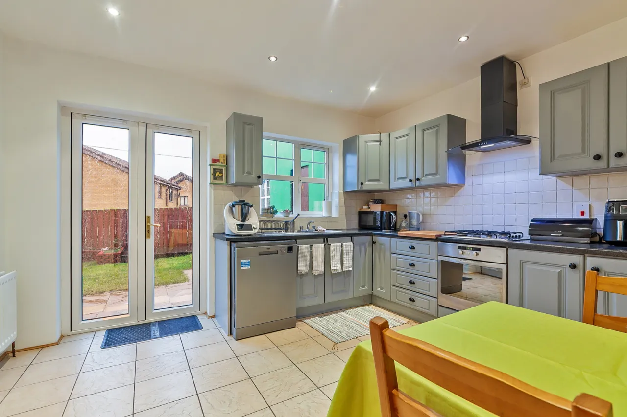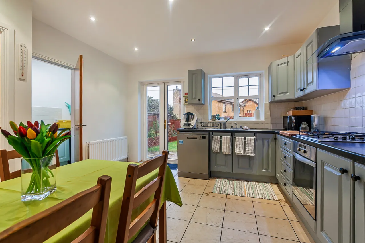 Comprises of a range of high and low level wooden units, one and a half bowl sink unit with mixer tap, four ring gas hob with overhead extractor unit and under bench oven. Plumbed for dishwasher, space for fridge and freezer, partly tiled walls, tiled floor, recessed lighting, ample formal dining space, access to rear garden and access to utility room.