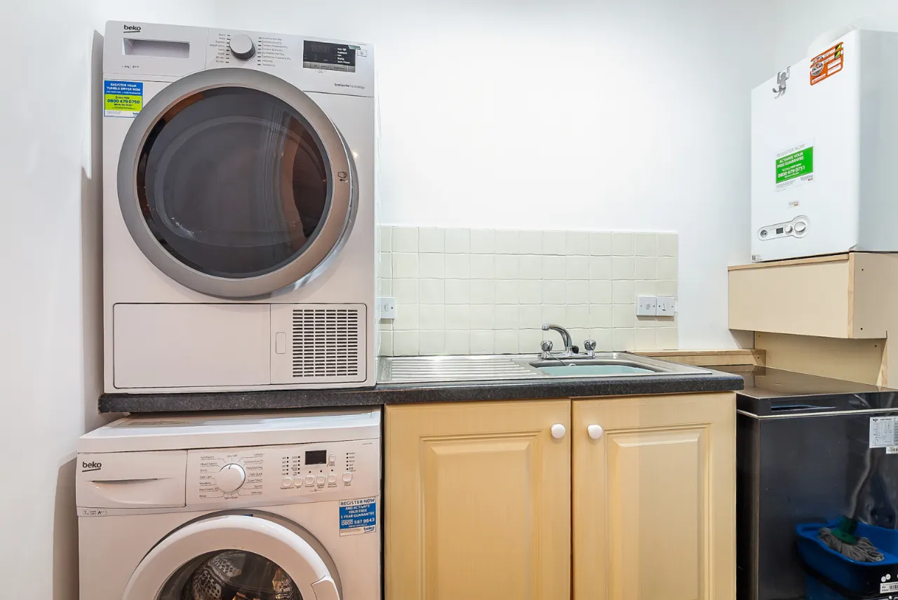 Range of low level units, plumbed for washing machine, space for tumble dryer, space for fridge and freezer and access to rear garden.