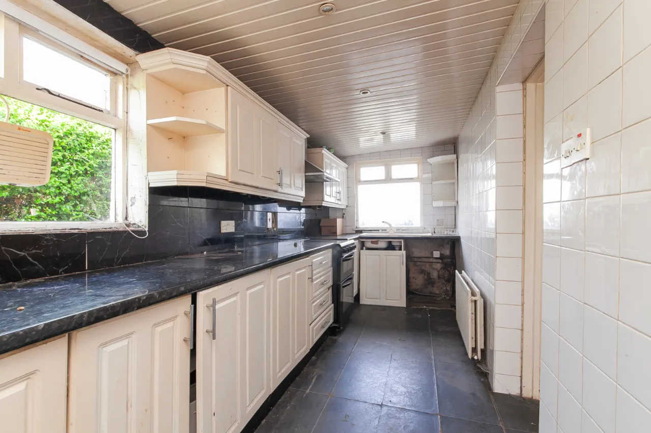 Comprises of high and low level units, space for free standing cooler, single bowl sink unit with drainer, plumbed for washing machine and tiled walls.