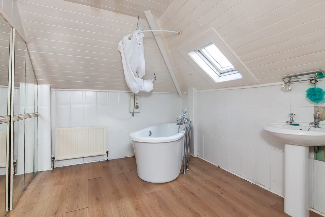 Free standing bath with telephone handle shower, low flush WC, pedestal wash hand basin with mixer tap and tiled walls.