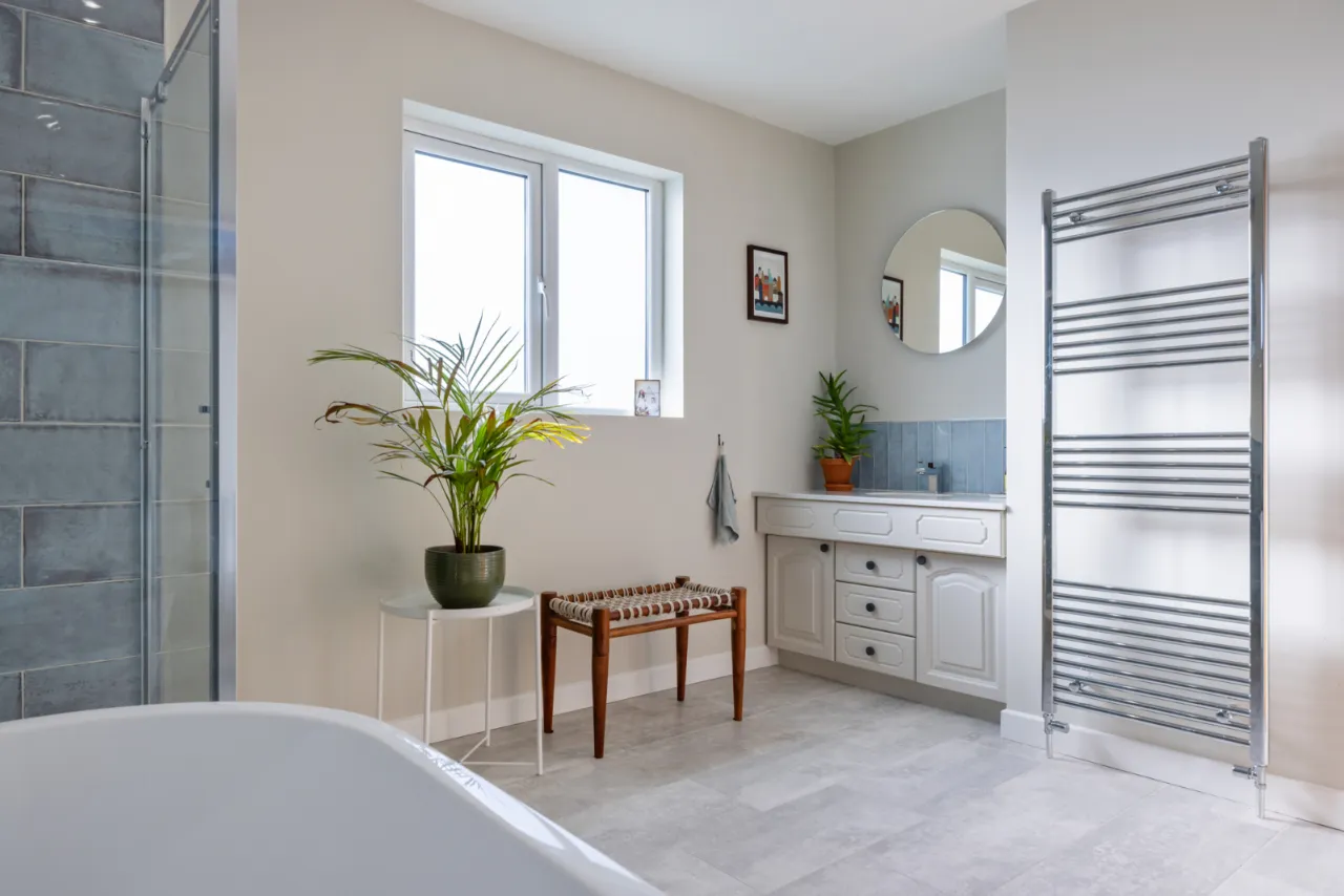 Modern white suite comprising: Separate fully tiled shower cubicle with thermostatically controlled shower, rain head and telephone hand shower, modern vanity sink unit with mixer taps, push button WC, feature tiling, ceramic tiled floor, extractor fan, chrome towel radiator.
