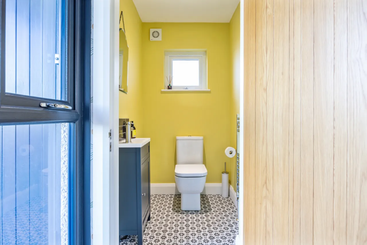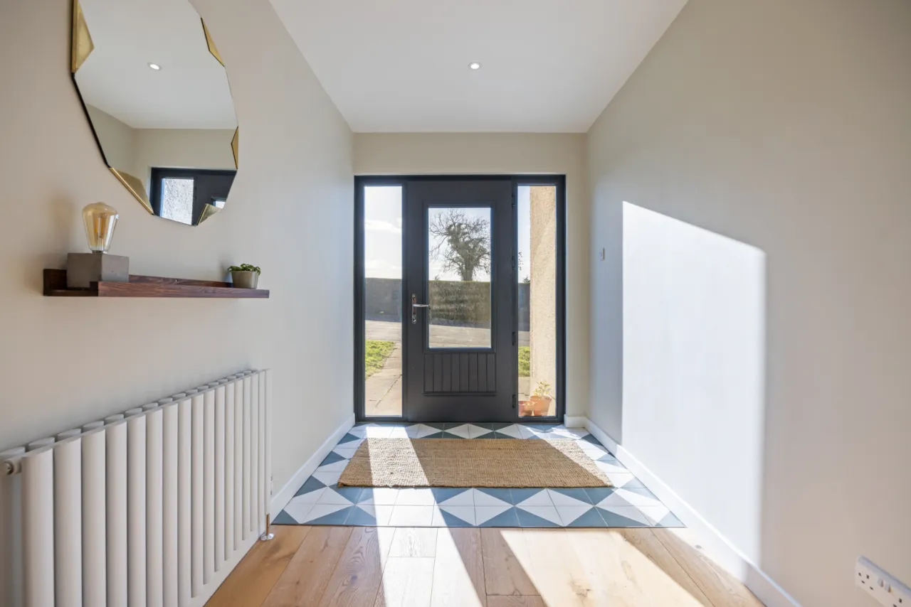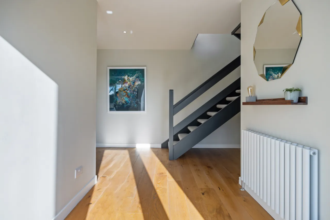 Part feature tiled floor, polished engineered oak floor, LED recessed spotlights.