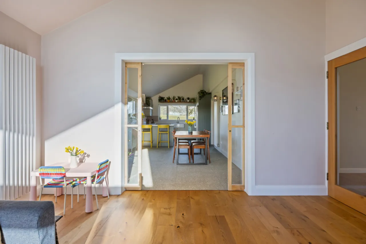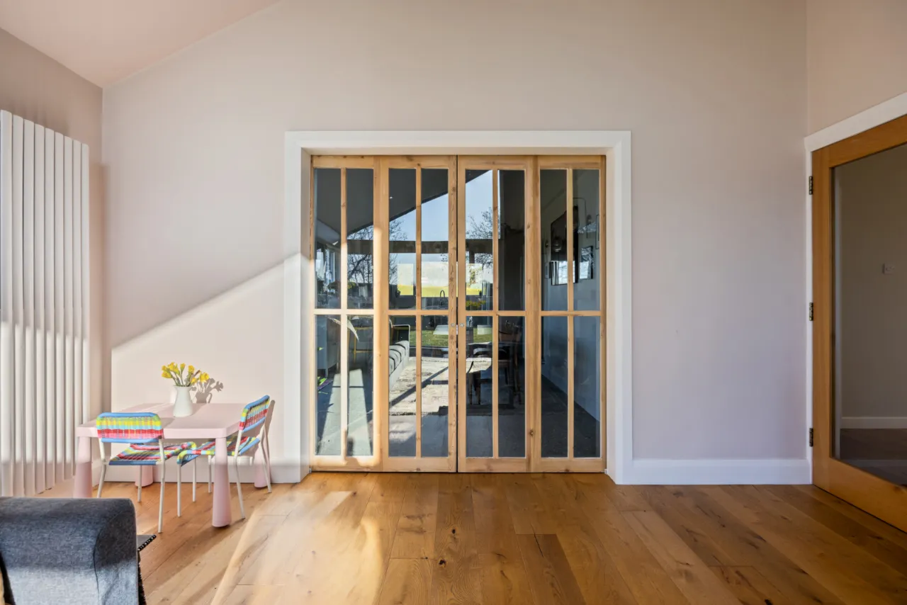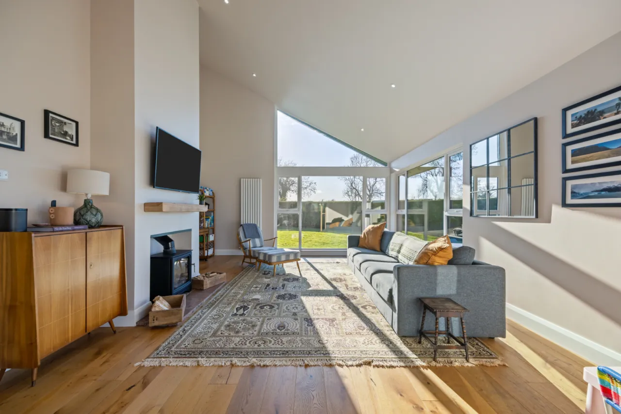 Feature vaulted ceiling, attractive fireplace, wood burning stove, floating oak sleeper mantle, granite tiled hearth, polished engineered oak floor, two vertical radiators, large corner window, views to Clandeboye Estate, twin glazed pocket doors to: