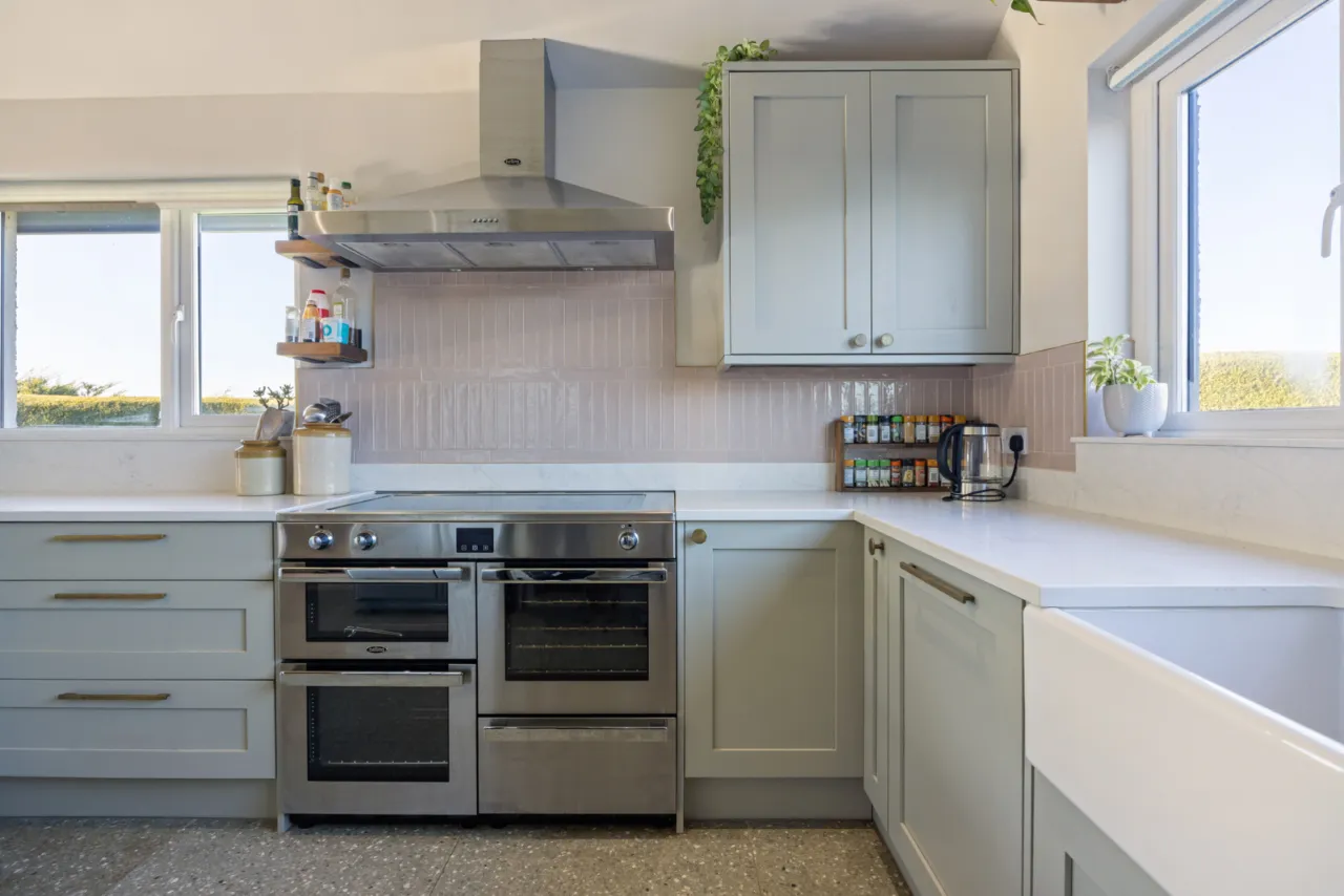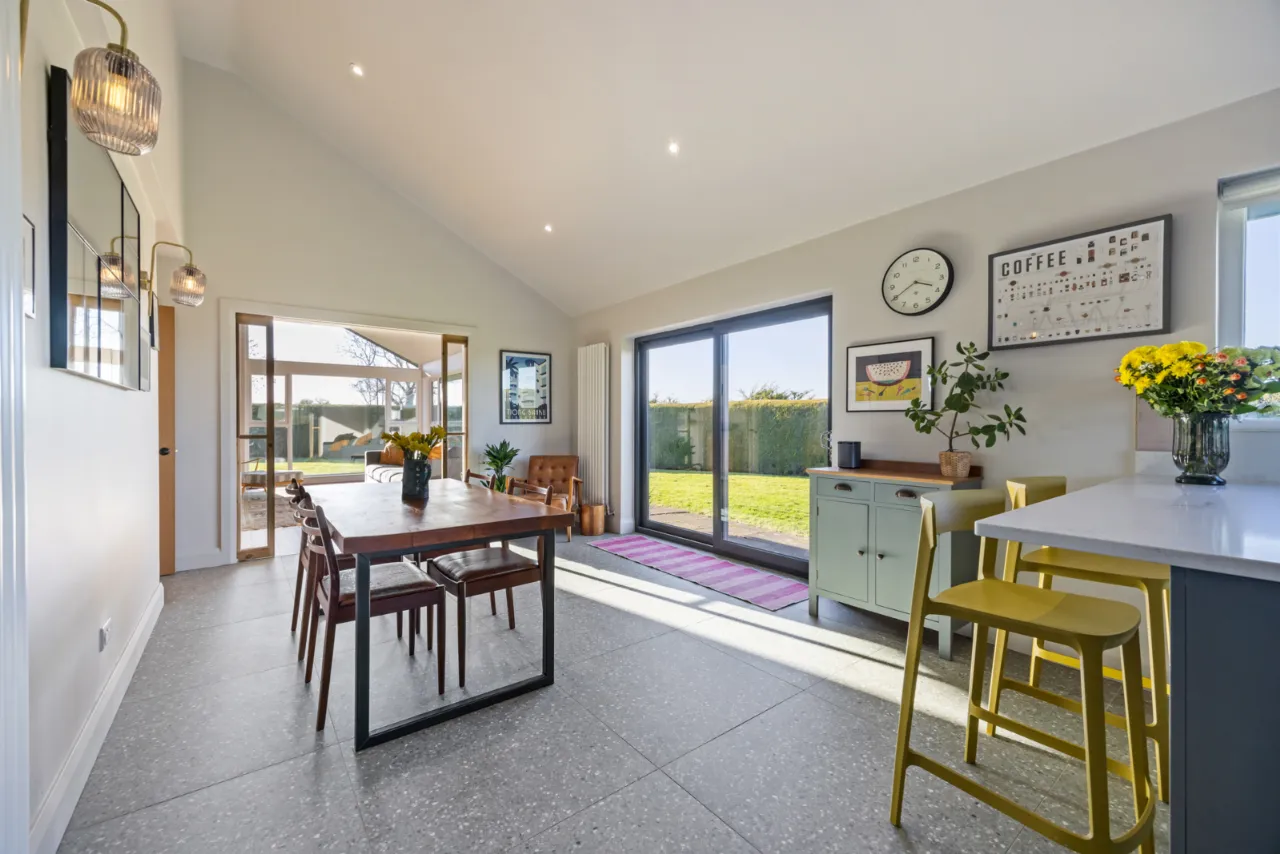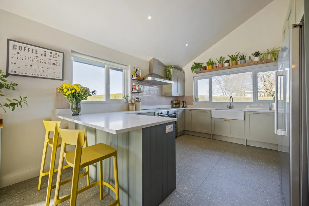 Twin tub Belfast sink with mixer taps, excellent range of high and low level 'Heritage Green' shaker style units, brass effect hardware, White Quartz worktops, freestanding Belling stainless steel 110 range cooker, Belling stainless steel extractor hood, recess for American fridge freezer, integrated dishwasher and bin storage, pull out larder, feature wall tiling, feature terrazzo style floor, vaulted ceiling, LED recessed spotlighting, dual aspect, wall light points, two vertical radiators, breakfast bar, dark grey sliding patio doors to side.