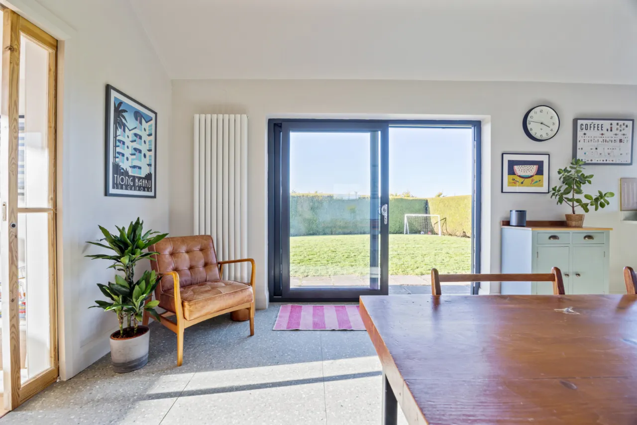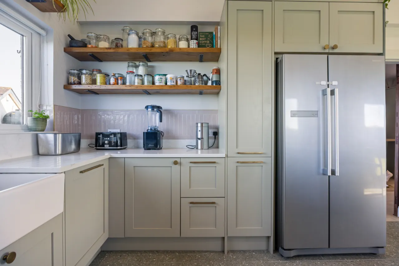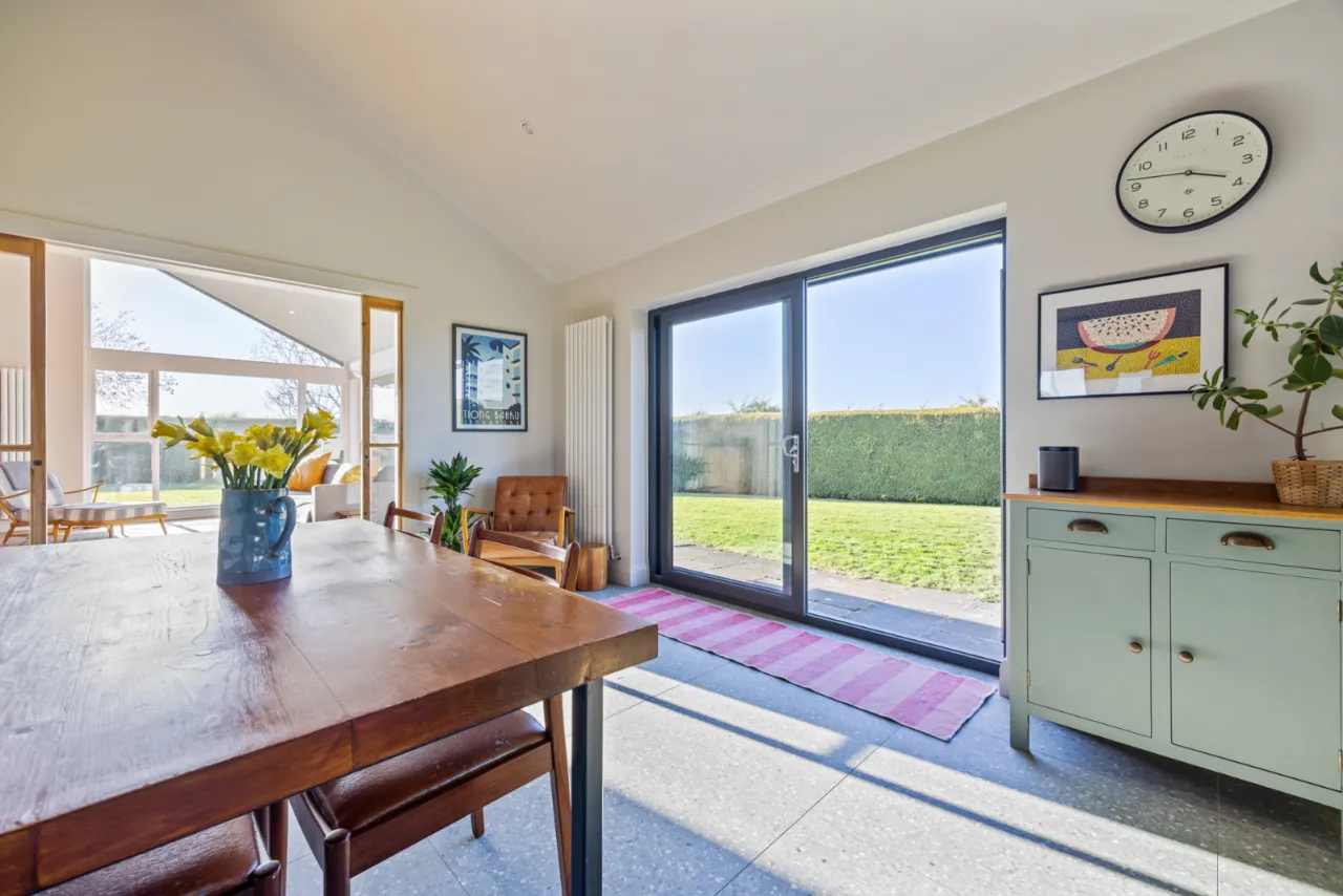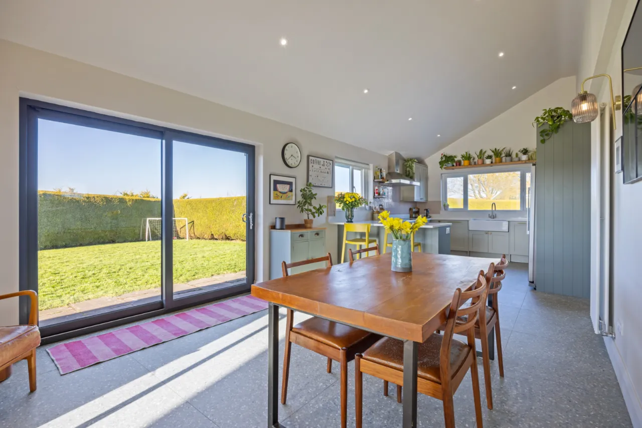 Twin tub Belfast sink with mixer taps, excellent range of high and low level 'Heritage Green' shaker style units, brass effect hardware, White Quartz worktops, freestanding Belling stainless steel 110 range cooker, Belling stainless steel extractor hood, recess for American fridge freezer, integrated dishwasher and bin storage, pull out larder, feature wall tiling, feature terrazzo style floor, vaulted ceiling, LED recessed spotlighting, dual aspect, wall light points, two vertical radiators, breakfast bar, dark grey sliding patio doors to side.