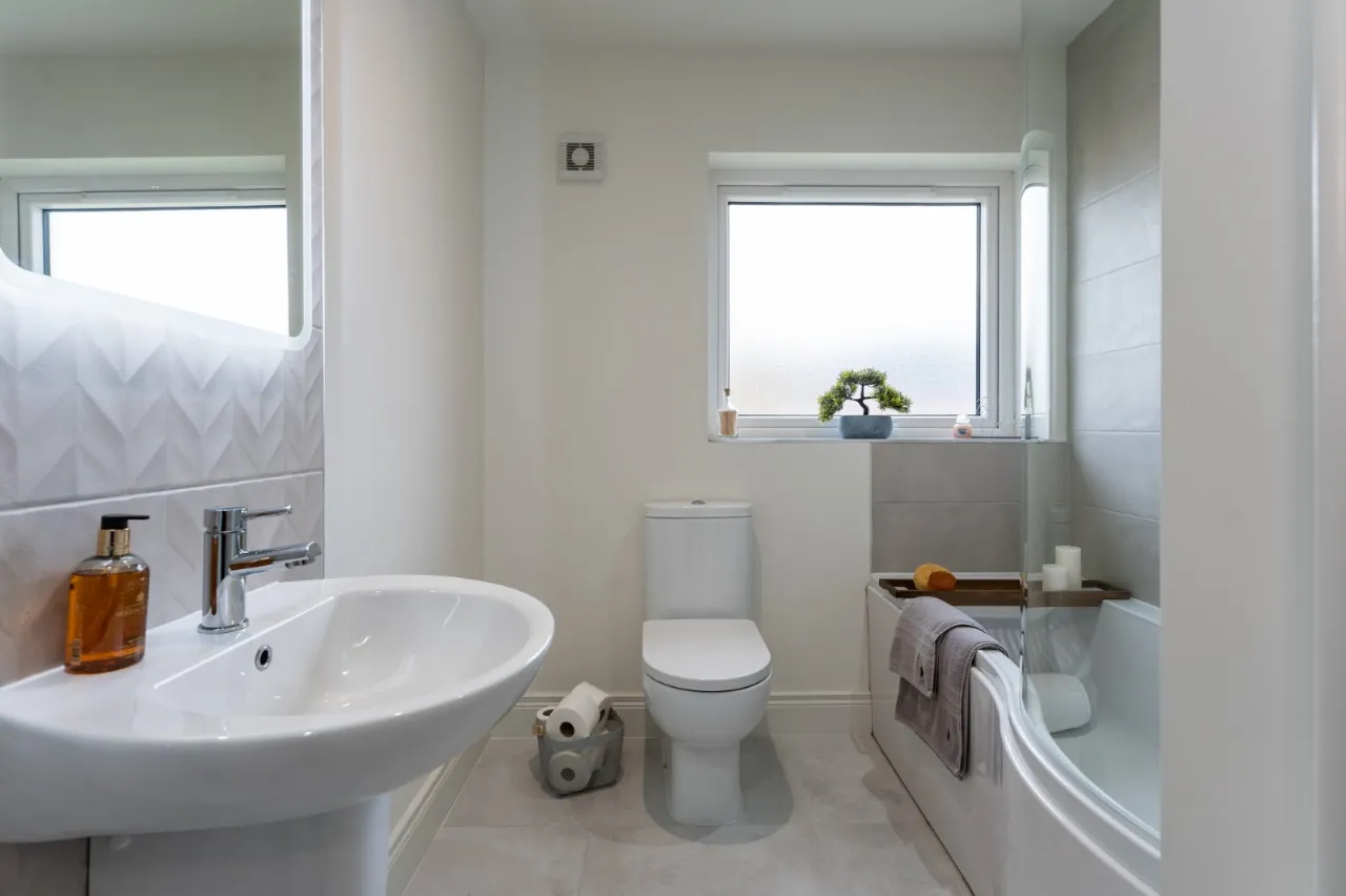 Modern white suite comprising:  Separate fully tiled shower cubicle with thermostatically controlled shower, wall mounted wash hand basin with mixer taps, push button WC, feature wall tiling, ceramic tiled floor, chrome towel radiator, LED recessed spotlighting, extractor fan, wired for wall mounted mirror.