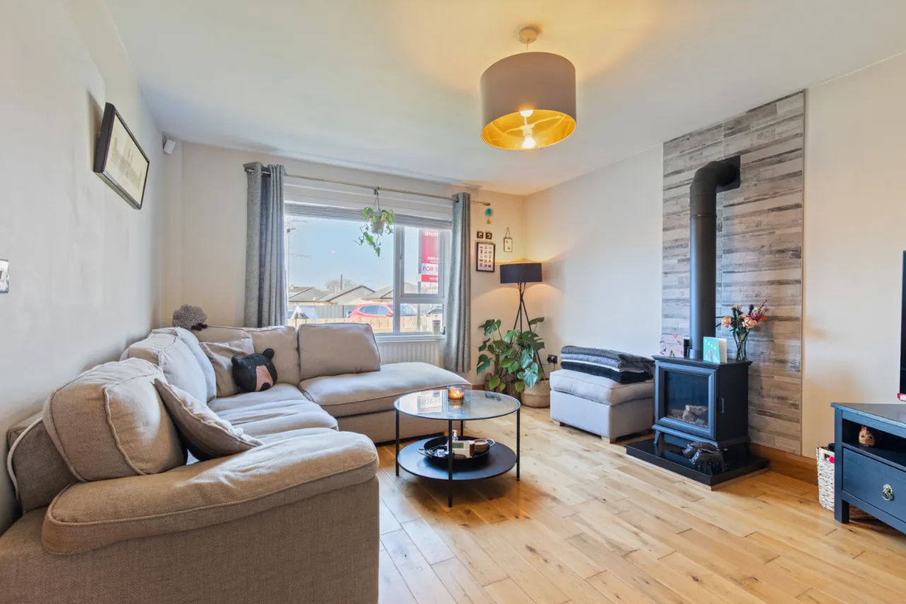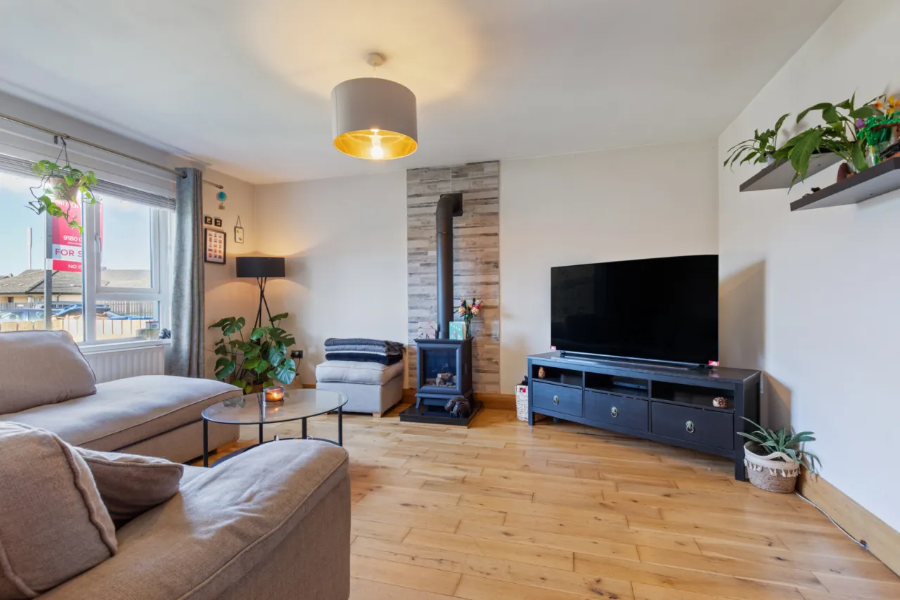 Feature cast iron stove with granite hearth, polished oak floor, wall tiling, TV point.