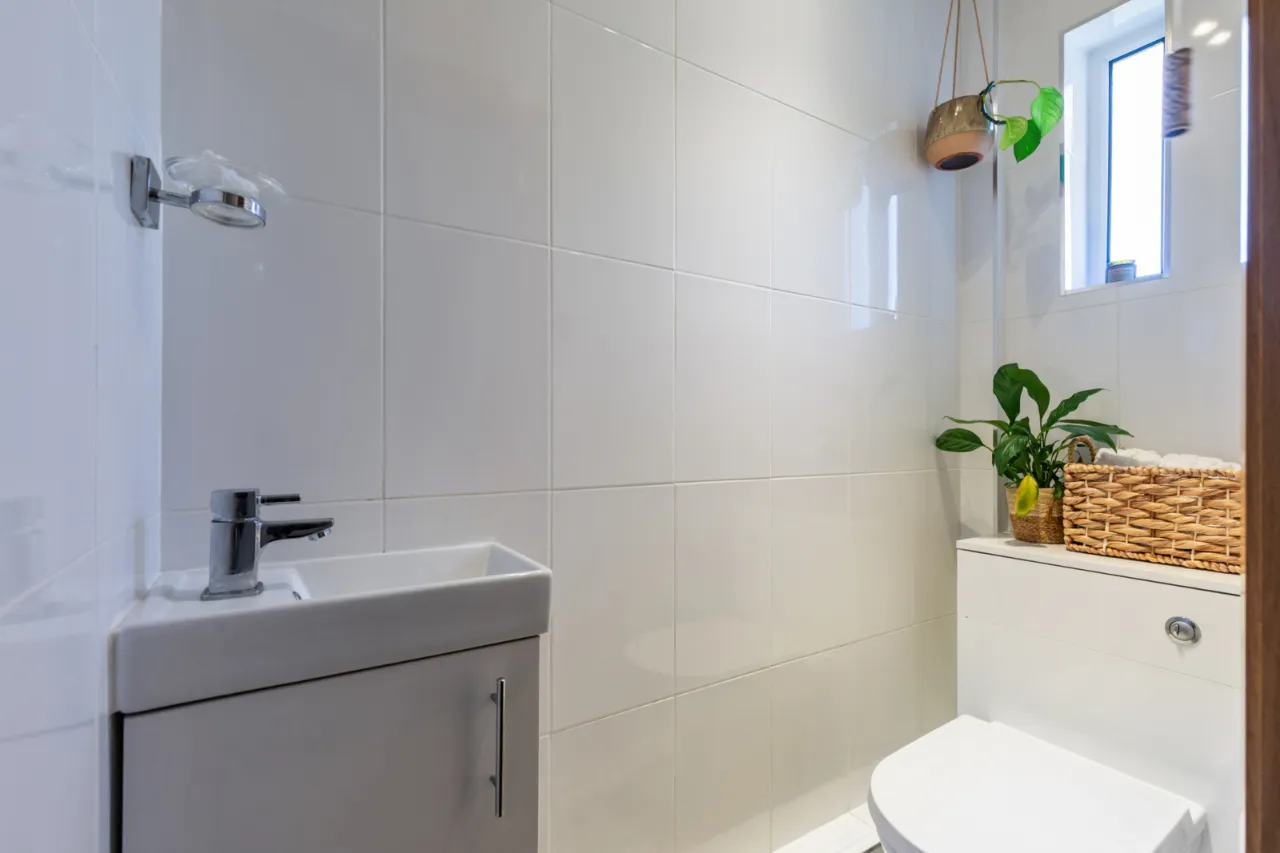 Modern white suite comprising: High gloss vanity sink unit with mixer taps, push button WC, feature tiled floor, fully tiled walls, extractor fan.