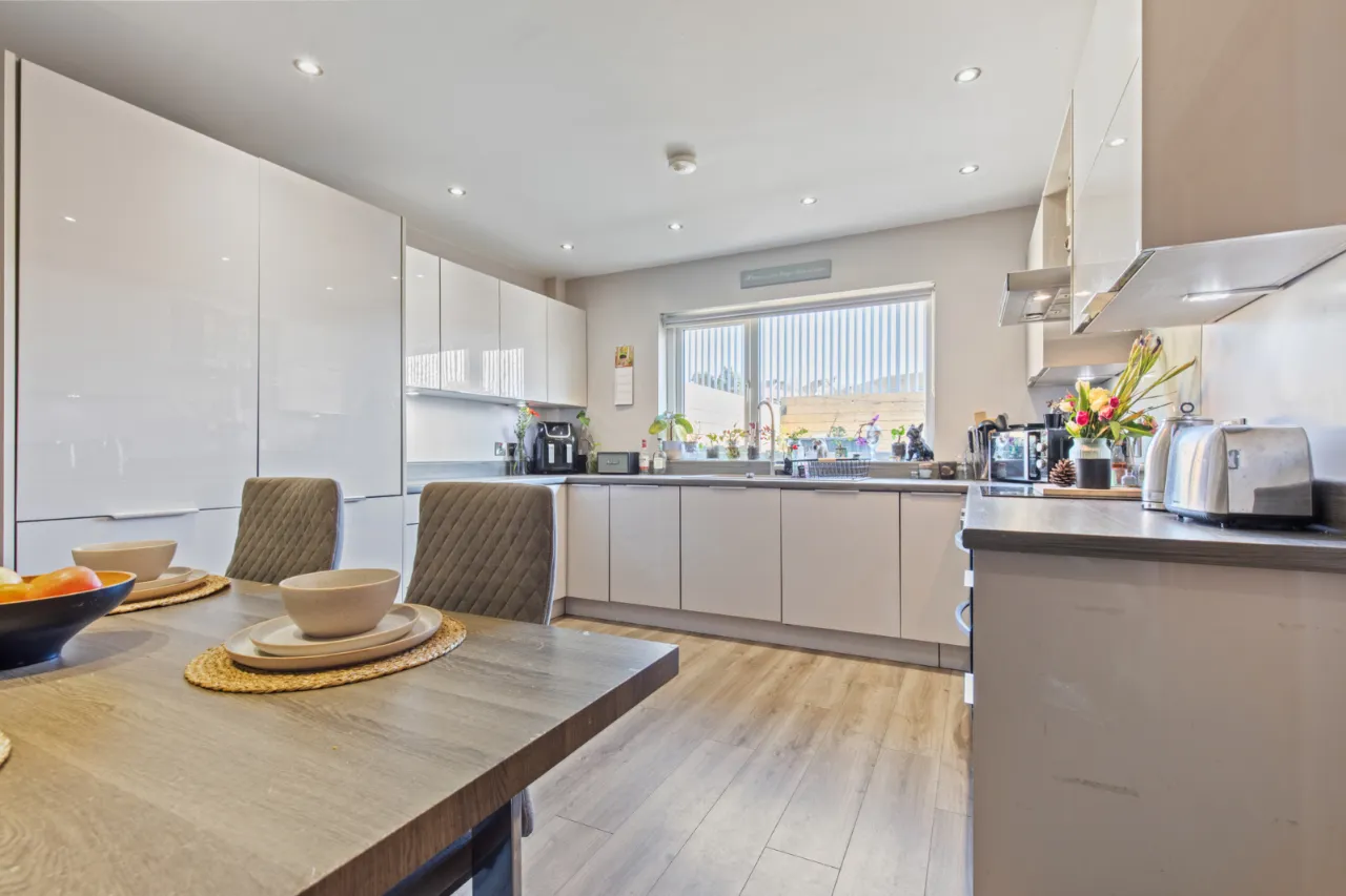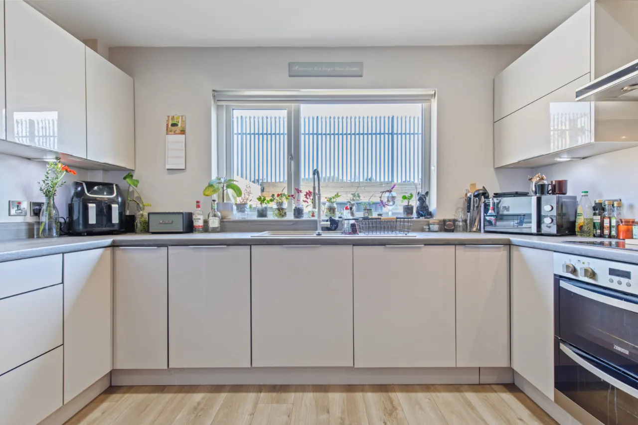 Blanco 1.5 tub single drainer sink unit with mixer taps, excellent range of high and low level grey and cream high gloss units, wood effect Formica roll edge work surfaces, double built in oven, 4 ring ceramic hob unit, stainless steel extractor hood, integrated fridge freezer and dishwasher, concealed lighting, wood effect polished laminate floor, LED recessed spotlighting.