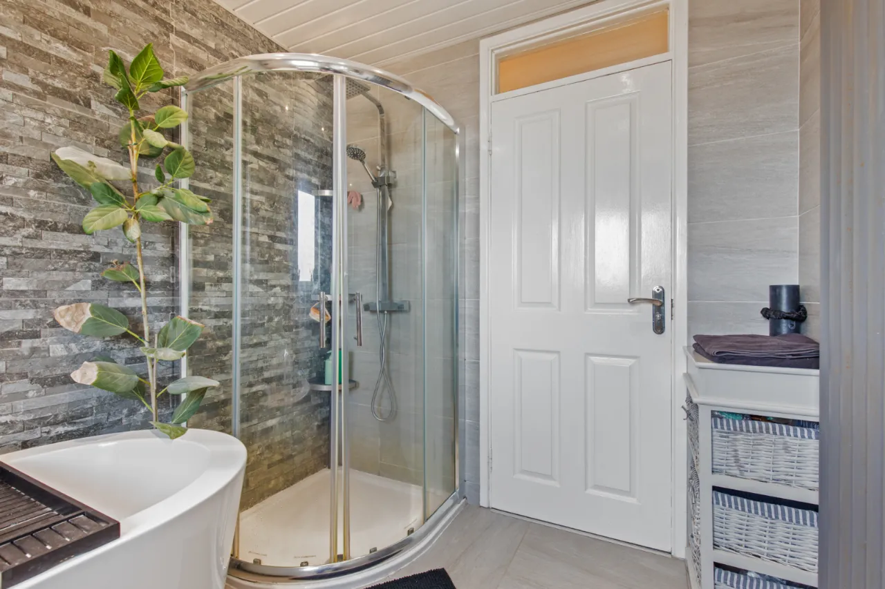 Modern white suite comprising: Freestanding bath with chrome mixer taps and telephone hand shower, separate fully tiled shower cubicle with thermostatically controlled shower, rain head and telephone hand shower, high gloss modern vanity sink unit with mixer taps, push button WC, feature vertical radiator, wired for wall mounted mirror, stone clad wall, fully tiled walls, ceramic tiled floor, LED recessed spotlighting, extractor fan.