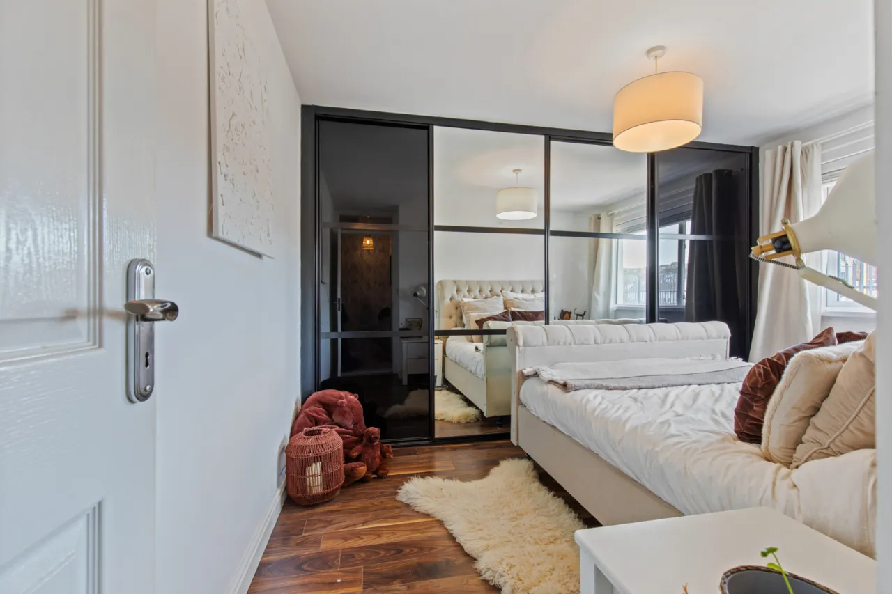 Excellent range of modern full width slide robes, polished laminate floor.
