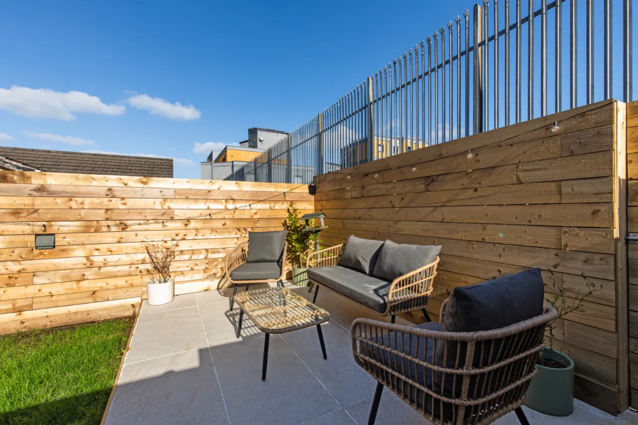 Gardens to front and rear in enclosed gardens laid out in lawn, stone paved path and feature raised patio, venetian style fencing to rear, outside light, outside water tap, access to rear for pedestrians, outdoor power socket.