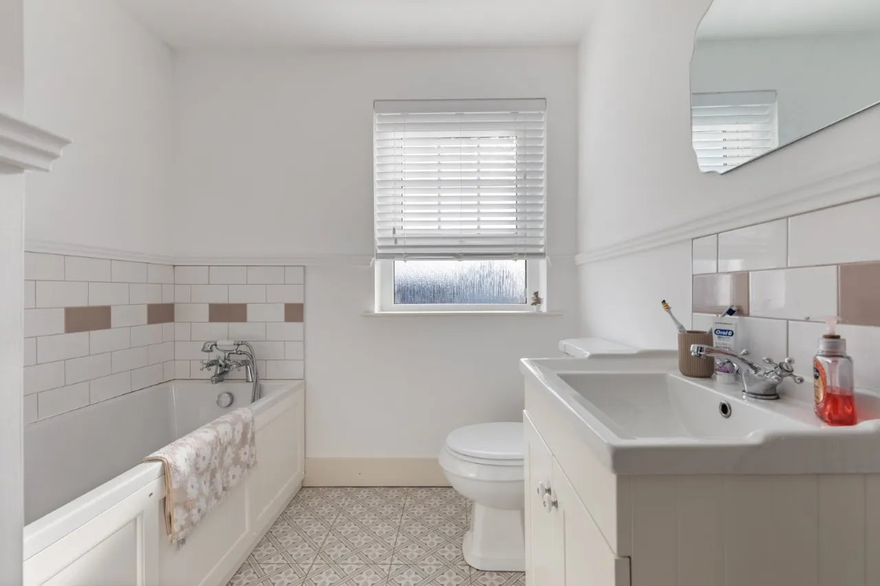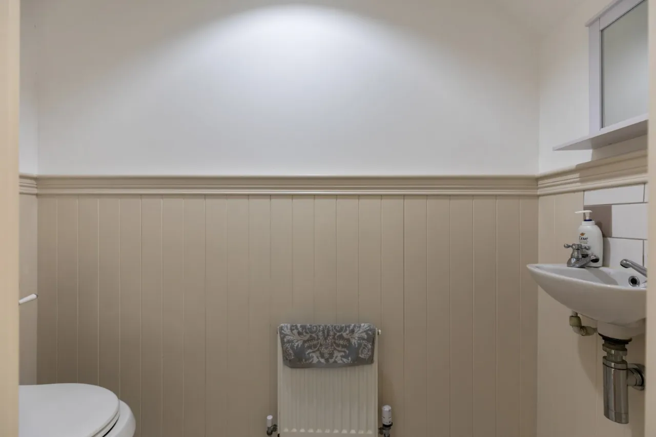 Traditional style white suite comprising: wall mounted wash hand basin, low flush WC, wood panelling, period style ceramic tiled floor, extractor fan.
