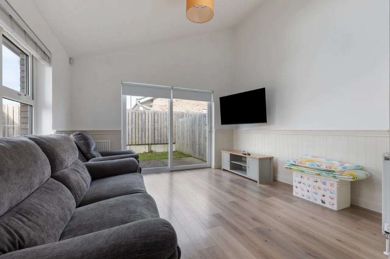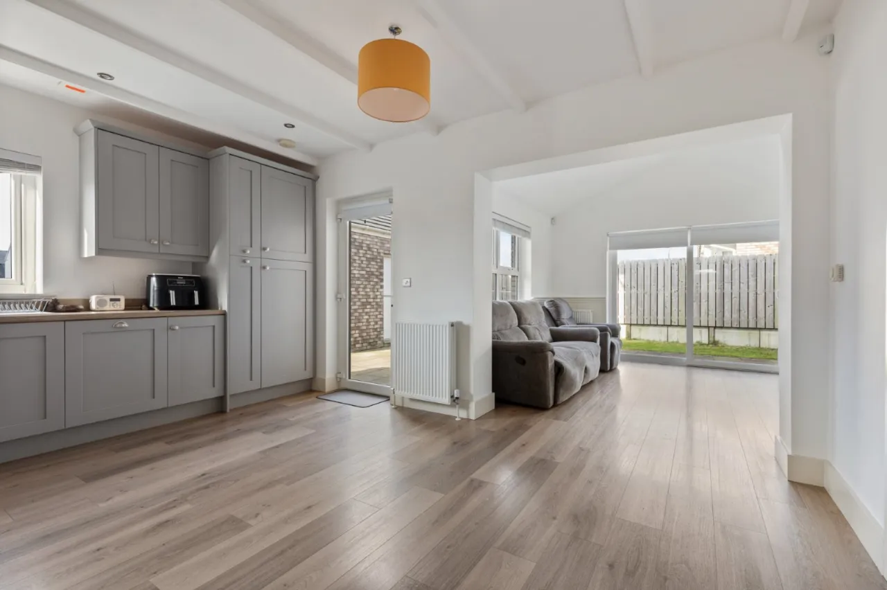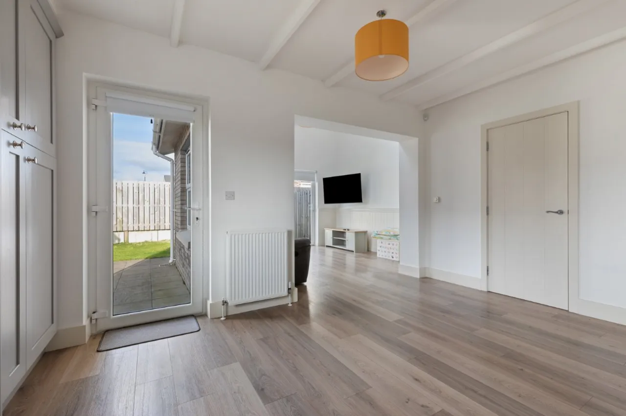 Polished laminate floor, wood panelling, dual aspect, wired for wall mounted TV, TV and telephone points, Keylite roof light, uPVC double glazed patio doors to rear.