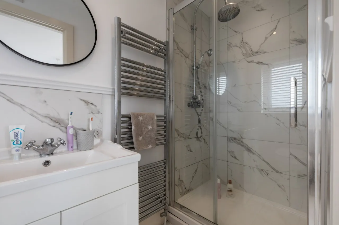 Traditional style white suite comprising: Large separate fully tiled shower cubicle with thermostatically controlled shower, rain head and telephone hand shower, vanity sink unit with mixer taps, low flush WC, chrome towel radiator, wall tiling, ceramic tiled floor, LED recessed spotlighting, extractor fan.