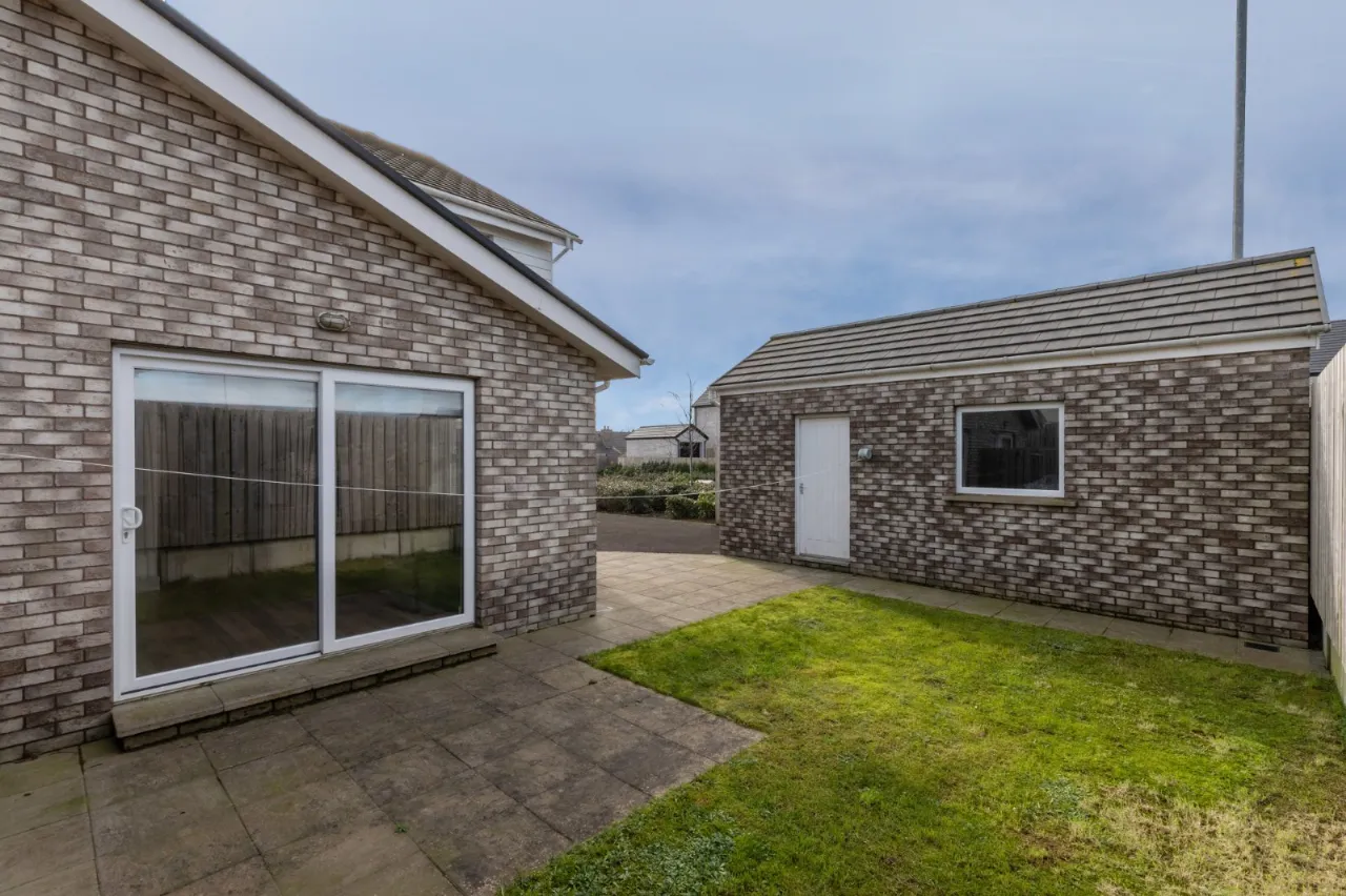 To front and rear in lawns, modern paved patio area, fencing, outside light, outside water tap.