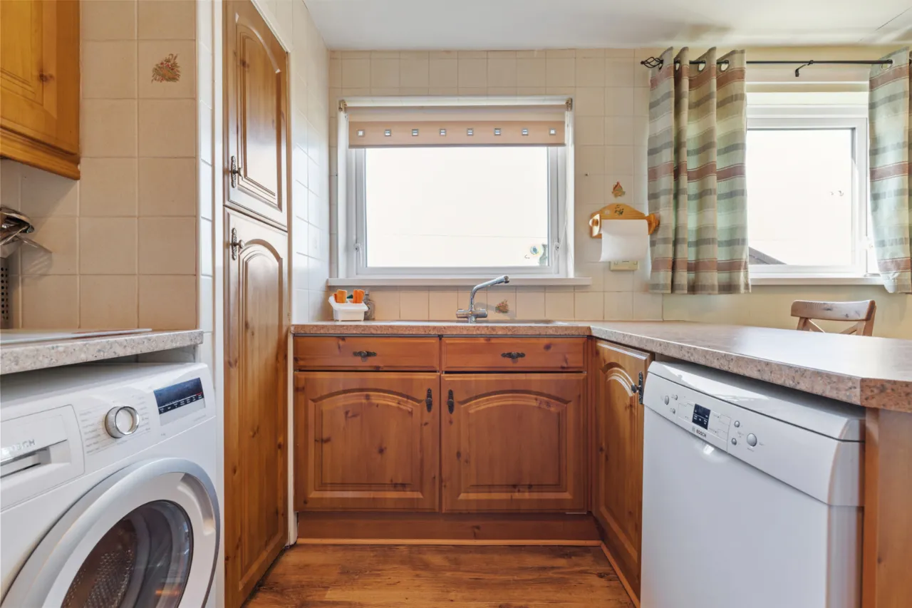 Stainless Steel Single Drainer Sink Unit with mixer taps, excellent range of high and low level units. Formica roll edge work surfaces, extractor fan (electric), 4 ring gas hob, double oven, washing machine, condensing tumble dryer, dishwasher, breakfast bar, pantry cupboard. Dining area has views to Scrabo Tower. UPVC double glazed door leading to rear garden.